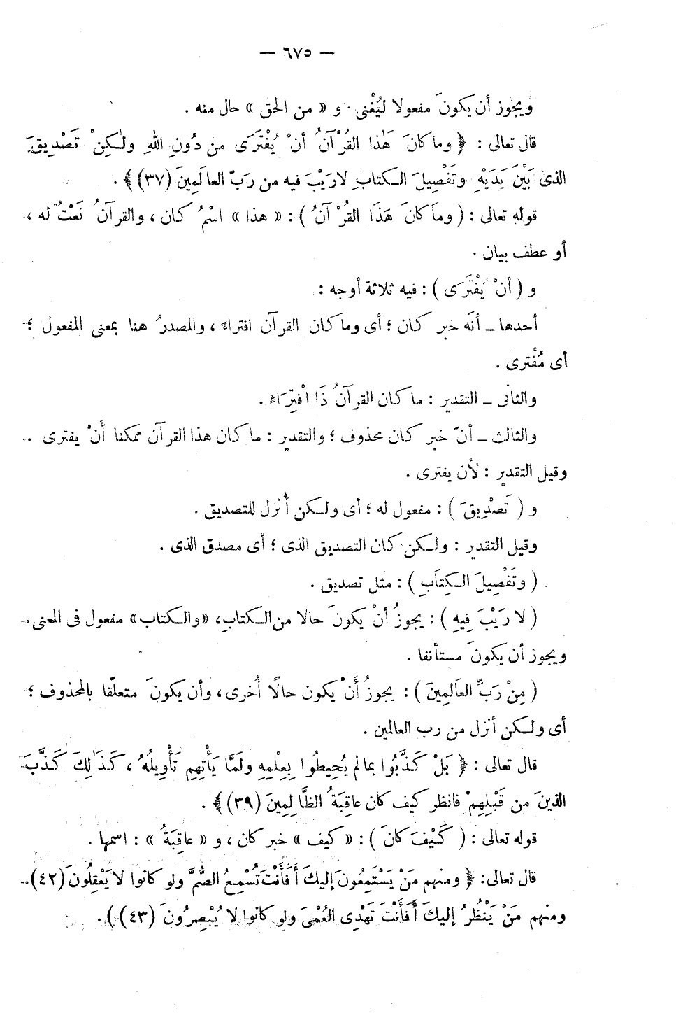 قَوْلُهُ تَعَالَى: (وَمَا كَانَ هَذَا الْقُرْآنُ) : (هَذَا) اسْمُ كَانَ، وَ (الْقُرْآنُ) نَعْتٌ لَهُ أَوْ عَطْفُ بَيَانٍ. وَ (أَنْ يُفْتَرَى) : فِيهِ ثَلَاثَةُ أَوْجُهٍ: أَحَدُهَا أَنَّهُ خَبَرُ كَانَ ; أَيْ وَمَا كَانَ الْقُرْآنُ افْتِرَاءً، وَالْمَصْدَرُ هُنَا بِمَعْنَى الْمَفْعُولِ ; أَيْ مُفْتَرًى. وَالثَّانِي: التَّقْدِيرُ مَا كَانَ الْقُرْآنُ ذَا افْتِرَاءٍ. وَالثَّالِثُ: أَنَّ خَبَرَ كَانَ مَحْذُوفٌ ; وَالتَّقْدِيرُ: مَا كَانَ هَذَا الْقُرْآنُ مُمْكِنًا أَنْ يُفْتَرَى. وَقِيلَ: التَّقْدِيرُ: لِأَنْ يُفْتَرَى.