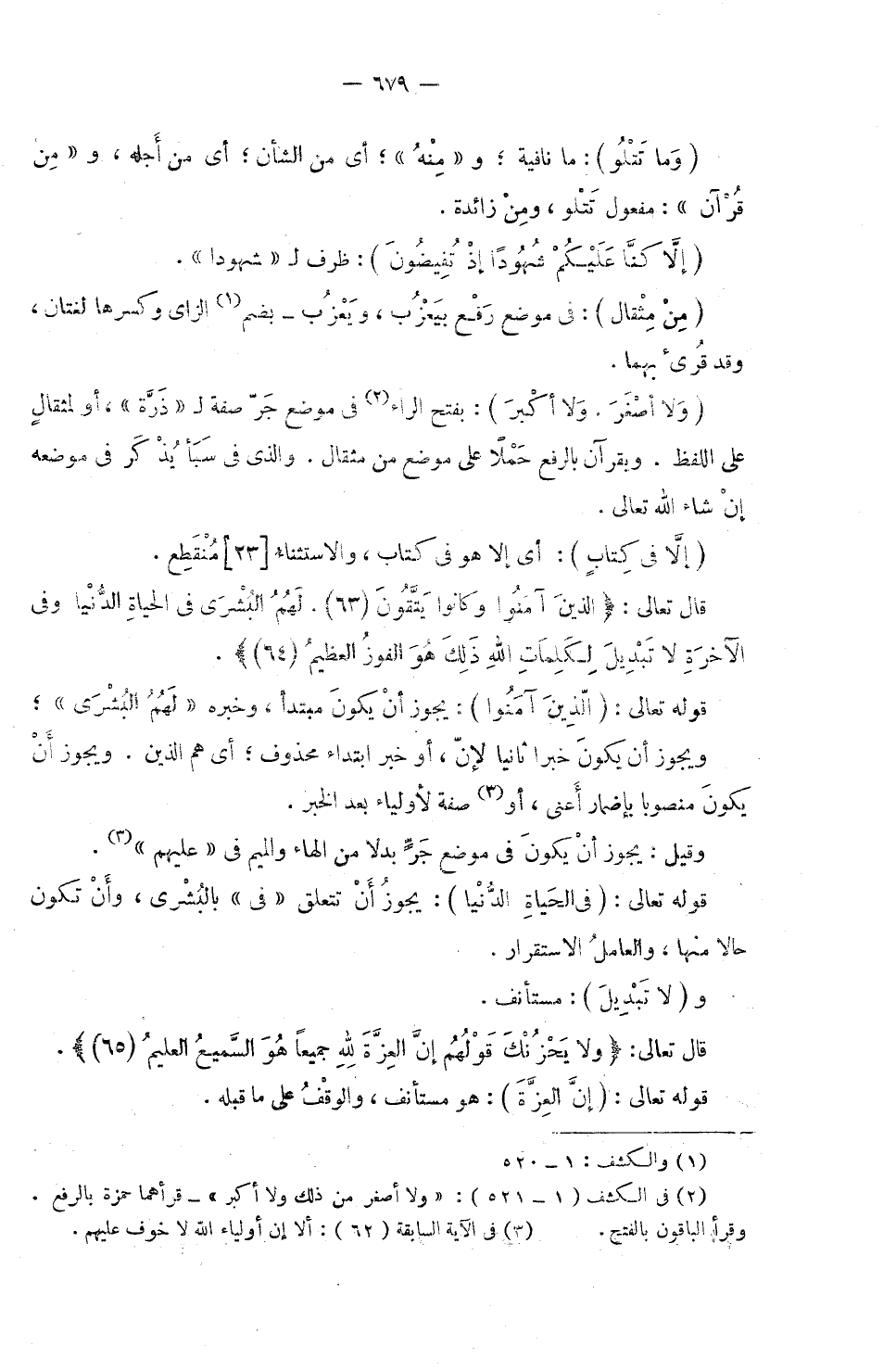 (وَلَا أَصْغَرَ) (وَلَا أَكْبَرَ) - بِفَتْحِ الرَّاءِ - فِي مَوْضِعِ جَرِّ صِفَةٍ لِـ «ذَرَّةٍ» أَوْ لِـ «مِثْقَالٍ» عَلَى اللَّفْظِ. وَيُقْرَآنِ بِالرَّفْعِ حَمْلًا عَلَى مَوْضِعِ «مِنْ مِثْقَالِ» وَالَّذِي فِي سَبَأٍ يُذْكَرُ فِي مَوْضِعِهِ إِنْ شَاءَ اللَّهُ تَعَالَى.