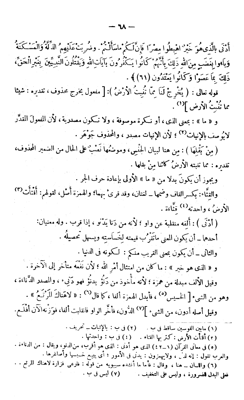 (مِنْ بَقْلِهَا) : مِنْ هُنَا لِبَيَانِ الْجِنْسِ، وَمَوْضِعُهَا نَصْبٌ عَلَى الْحَالِ مِنَ الضَّمِيرِ الْمَحْذُوفِ تَقْدِيرُهُ: مِمَّا تُنْبِتُهُ الْأَرْضُ كَائِنًا مِنْ بَقْلِهَا، وَيَجُوزُ أَنْ يَكُونَ بَدَلًا مِنْ مَا الْأَوْلَى بِإِعَادَةِ حَرْفِ الْجَرِّ، وَالْقِثَّاءُ بِكَسْرِ الْقَافِ وَضَمِّهَا لُغَتَانِ. وَقَدْ قُرِئَ بِهِمَا ; وَالْهَمْزَةُ أَصْلٌ لِقَوْلِهِمْ أَقْثَأَتِ الْأَرْضُ، وَاحِدَتُهُ قَثَّاءَةٌ. (أَدْنَى) : أَلِفُهُ مُنْقَلِبَةٌ عَنْ وَاوٍ ; لِأَنَّهُ مِنْ دَنَا يَدْنُو إِذَا قَرُبَ. وَلَهُ مَعْنَيَانِ: أَحَدُهُمَا: أَنْ يَكُونَ الْمَعْنَى مَا تَقْرُبُ قِيمَتُهُ لِخَسَاسَتِهِ، وَيَسْهُلُ تَحْصِيلُهُ.