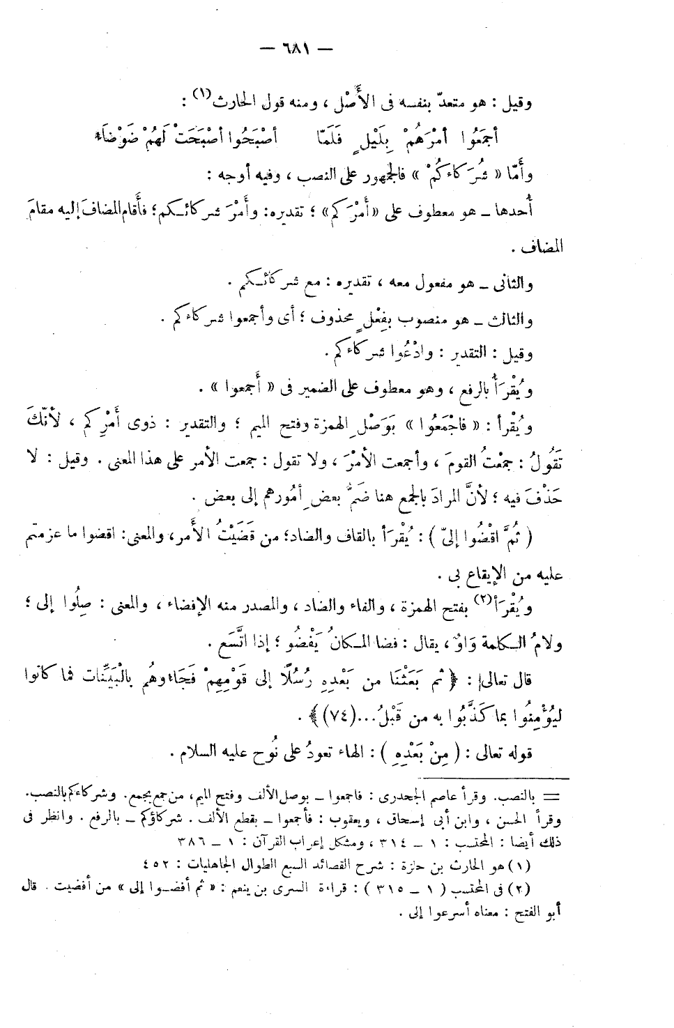 وَأَمَّا: (شُرَكَاءَكُمْ) فَالْجُمْهُورُ عَلَى النَّصْبِ، وَفِيهِ أَوْجُهٌ: أَحَدُهَا: هُوَ مَعْطُوفٌ عَلَى «أَمْرَكُمْ» تَقْدِيرُهُ: وَأَمَرَ شُرَكَائِكُمْ ; فَأَقَامَ الْمُضَافَ إِلَيْهِ مَقَامَ الْمُضَافِ. وَالثَّانِي: هُوَ مَفْعُولٌ مَعَهُ تَقْدِيرُهُ: مَعَ شُرَكَائِكُمْ. وَالثَّالِثُ: هُوَ مَنْصُوبٌ بِفِعْلٍ مَحْذُوفٍ ; أَيْ وَأَجْمِعُوا شُرَكَاءَكُمْ. وَقِيلَ: التَّقْدِيرُ: وَادْعُوا شُرَكَاءَكُمْ.