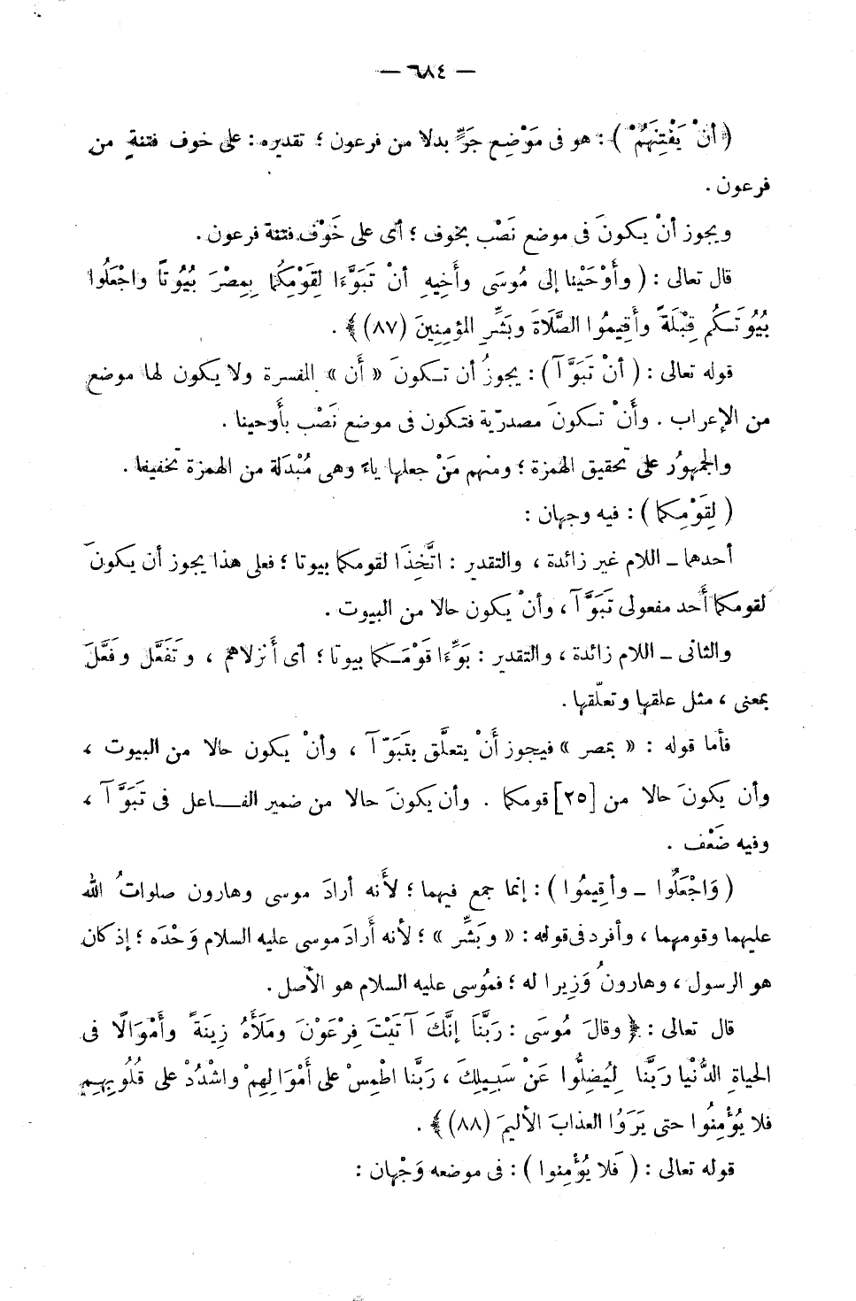 فَأَمَّا قَوْلُهُ «بِمِصْرَ» فَيَجُوزُ أَنْ يَتَعَلَّقَ بِتَبَوَّءَا، وَأَنْ يَكُونَ حَالًا مِنَ الْبُيُوتِ، وَأَنْ يَكُونَ حَالًا مِنْ قَوْمِكُمَا. وَأَنْ يَكُونَ حَالًا مِنْ ضَمِيرِ الْفَاعِلِ فِي تَبَوَّأَ، وَفِيهِ ضَعْفٌ.