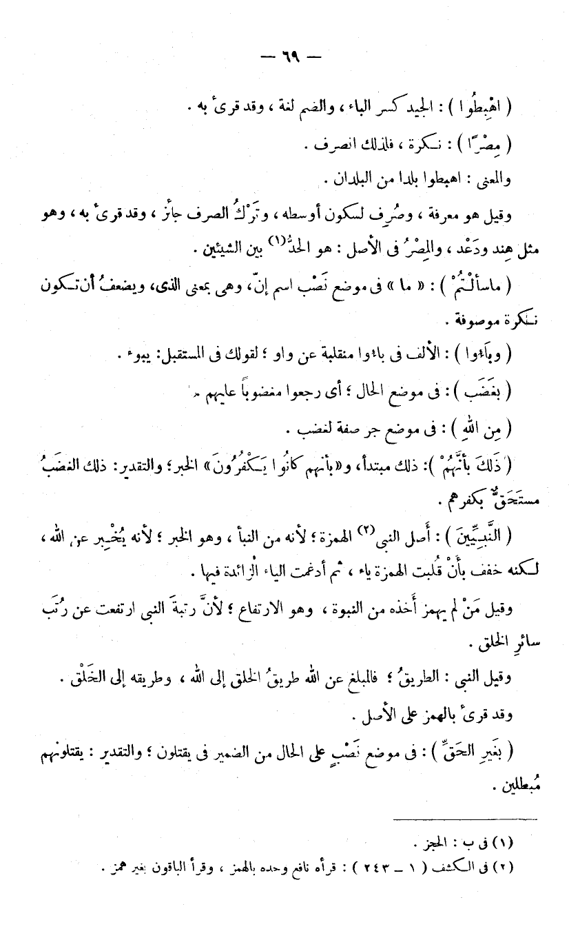 (مِنَ اللَّهِ) : فِي مَوْضِعِ جَرٍّ صِفَةٌ لِغَضَبٍ. (ذَلِكَ بِأَنَّهُمْ) : ذَلِكَ مُبْتَدَأٌ، وَبِأَنَّهُمْ كَانُوا يَكْفُرُونَ الْخَبَرُ، وَالتَّقْدِيرُ: ذَلِكَ الْغَضَبُ مُسْتَحَقٌّ بِكُفْرِهِمْ. (النَّبِيِّينَ) : أَصْلُ النَّبِيِّ الْهَمْزَةُ ; لِأَنَّهُ مِنَ النَّبَأِ وَهُوَ الْخَبَرُ ; لِأَنَّهُ يُخْبِرُ عَنِ اللَّهِ، لَكِنَّهُ خُفِّفَ بِأَنْ قُلِبَتِ الْهَمْزَةُ يَاءً، ثُمَّ أُدْغِمَتِ الْيَاءُ الزَّائِدَةُ فِيهَا. وَقِيلَ: مَنْ لَمْ يَهْمِزْ أَخَذَهُ مِنَ النُّبُوَّةِ وَهُوَ الِارْتِفَاعُ ; لِأَنَّ رُتْبَةَ النَّبِيِّ ارْتَفَعَتْ عَنْ رُتَبِ سَائِرِ الْخَلْقِ. وَقِيلَ النَّبِيُّ الطَّرِيقُ، فَالْمُبَلِّغُ عَنِ اللَّهِ طَرِيقُ الْخَلْقِ إِلَى اللَّهِ، وَطَرِيقُهُ إِلَى الْخَلْقِ.