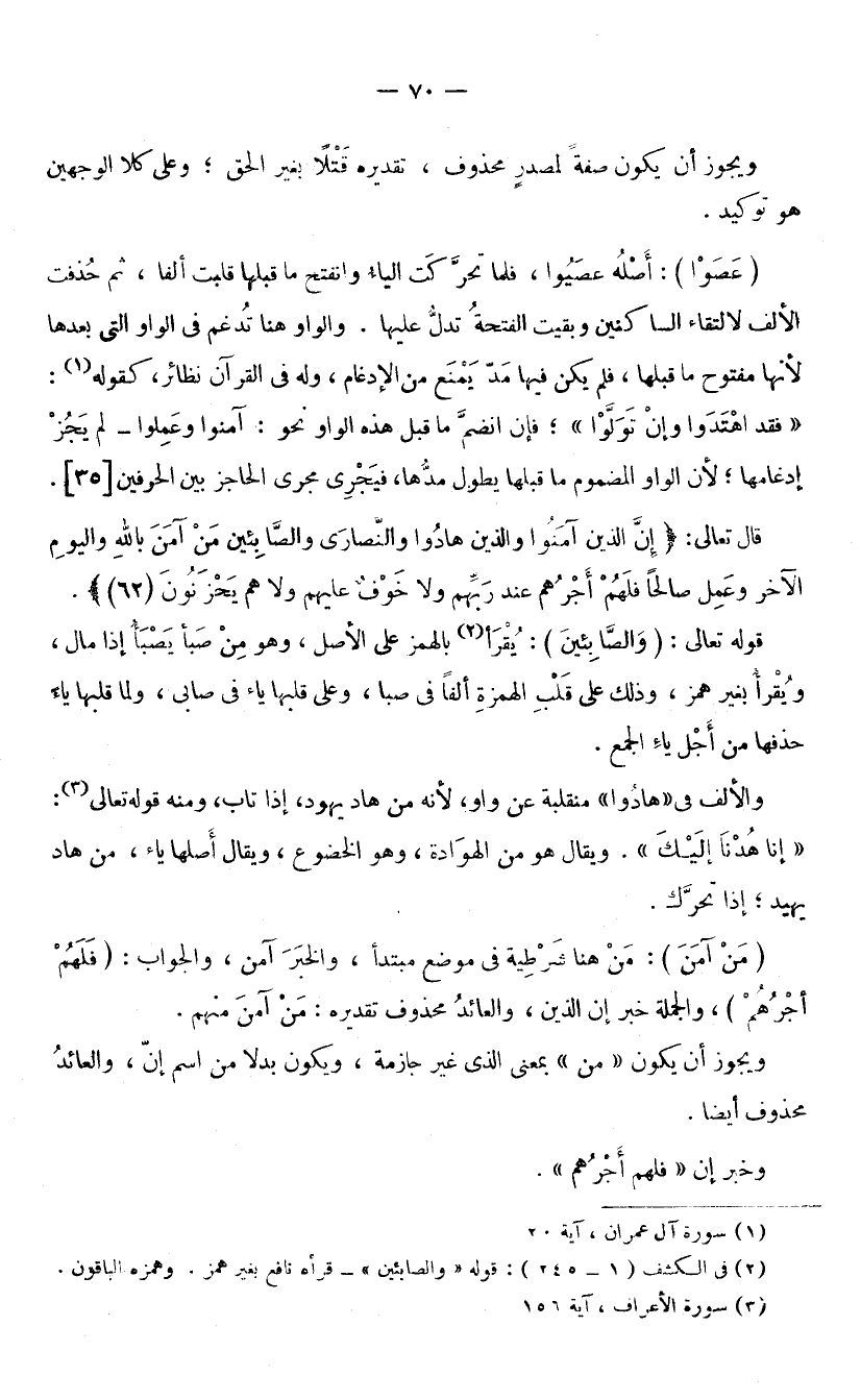وَالْأَلِفُ فِي هَادُوا مُنْقَلِبَةٌ عَنْ وَاوٍ ; لِأَنَّهُ مَنْ هَادَ يَهُودُ إِذَا تَابَ وَمِنْهُ قَوْلُهُ تَعَالَى: «إِنَّا هُدْنَا إِلَيْكَ» ، وَيُقَالُ هُوَ مِنَ الْهَوَادَةِ، وَهُوَ الْخُضُوعُ، وَيُقَالُ أَصْلُهَا يَاءٌ مِنْ هَادَ يَهِيدُ إِذَا تَحَرَّكَ: مَنْ آمَنُ مَنْ هُنَا شُرْطِيَّةٌ فِي مَوْضِعِ مُبْتَدَأٍ وَالْخَبَرُ آمَنَ، وَالْجَوَابُ: فَلَهُمْ أَجْرُهُمْ وَالْجُمْلَةُ خَبَرُ إِنَّ الَّذِينَ، وَالْعَائِدُ مَحْذُوفٌ تَقْدِيرُهُ: مَنْ آمَنَ مِنْهُمْ.