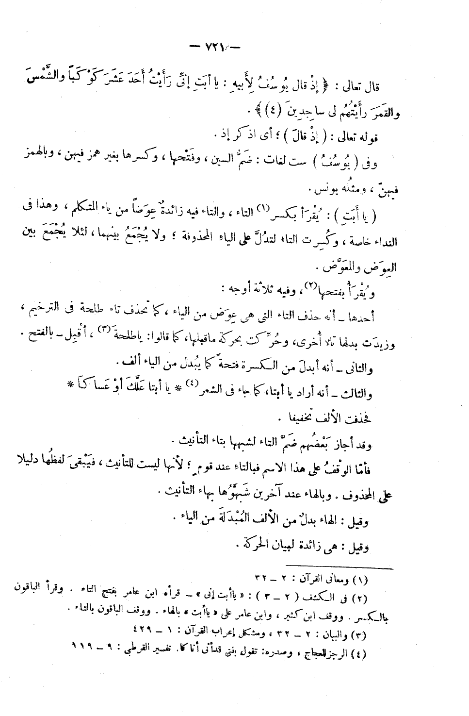 (يَا أَبَتِ) : يُقْرَأُ بِكَسْرِ التَّاءِ، وَالتَّاءُ فِيهِ زَائِدَةٌ عِوَضًا مِنْ يَاءِ الْمُتَكَلِّمِ، وَهَذَا فِي النِّدَاءِ خَاصَّةً، وَكُسِرَتِ التَّاءُ لِتَدُلَّ عَلَى الْيَاءِ الْمَحْذُوفَةِ ; وَلَا يُجْمَعُ بَيْنَهُمَا، لِئَلَّا يُجْمَعَ بَيْنَ الْعِوَضِ وَالْمُعَوَّضِ.