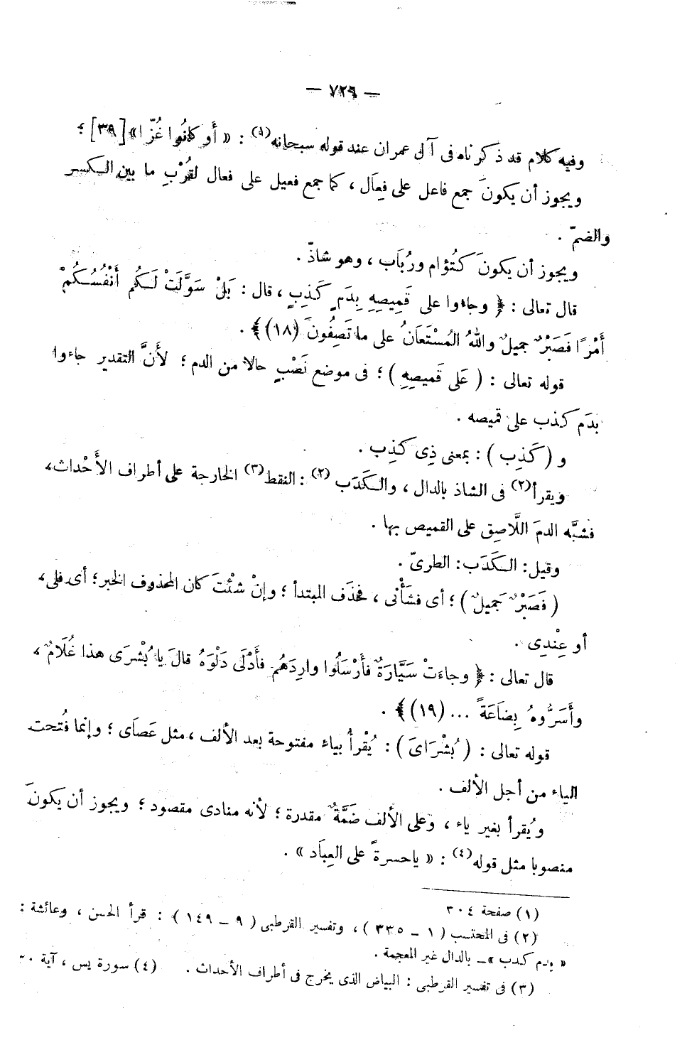 قَوْلُهُ تَعَالَى: (عَلَى قَمِيصِهِ) : فِي مَوْضِعِ نَصْبٍ حَالًا مِنَ الدَّمِ ; لِأَنَّ التَّقْدِيرَ: جَاءُوا بِدَمٍ كَذِبٍ عَلَى قَمِيصِهِ. وَ (كَذِبٍ) : بِمَعْنَى ذِي كَذِبٍ. وَيُقْرَأُ فِي الشَّاذِّ بِالدَّالِ، وَالْكَدَبُ: النُّقَطُ الْخَارِجَةُ عَلَى أَطْرَافِ الْأَحْدَاثِ، فَشَبَّهَ الدَّمَ اللَّاصِقَ عَلَى الْقَمِيصِ بِهَا.