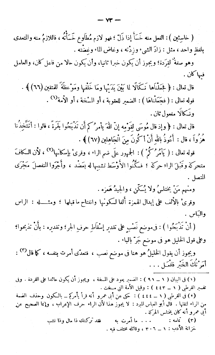 وَقُرِئَ بِالْأَلِفِ عَلَى إِبْدَالِ الْهَمْزَةِ أَلِفًا لِسُكُونِهَا وَانْفِتَاحِ مَا قَبْلَهَا، وَمِثْلُهُ الرَّاسُ وَالْبَاسُ. (أَنْ تَذْبَحُوا) : فِي مَوْضِعِ نَصْبٍ عَلَى تَقْدِيرِ إِسْقَاطِ حَرْفِ الْجَرِّ، وَتَقْدِيرُهُ بِأَنْ تَذْبَحُوا، وَعَلَى قَوْلِ الْخَلِيلِ هُوَ فِي مَوْضِعِ جَرٍّ بِالْبَاءِ.