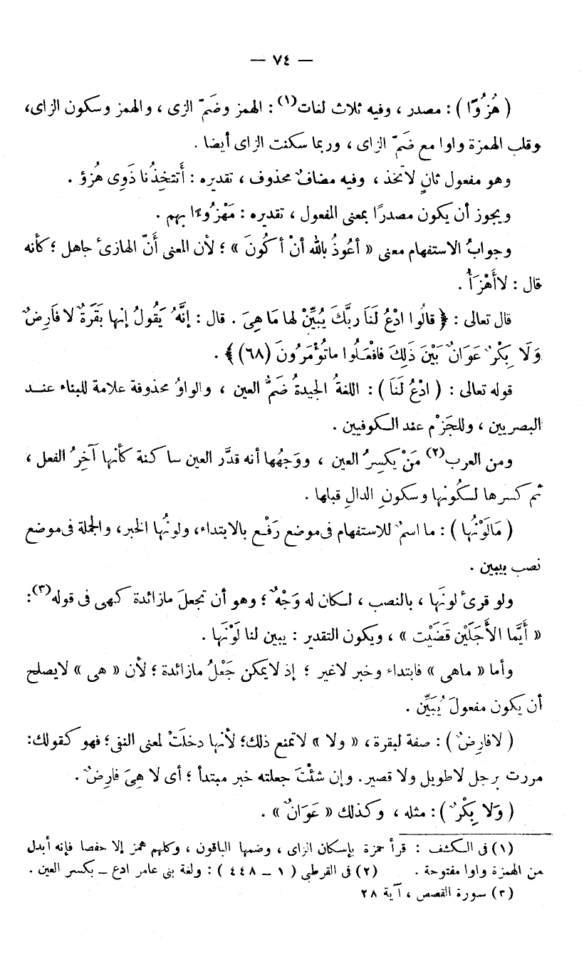 هُزُوًا) : مَصْدَرٌ، وَفِيهِ ثَلَاثُ لُغَاتٍ: الْهَمْزُ وَضَمُّ الزَّايِ، وَالْهَمْزُ وَسُكُونُ الزَّايِ، وَقَلْبُ الْهَمْزَةِ وَاوًا مَعَ ضَمِّ الزَّايِ، وَرُبَّمَا سُكِّنَتِ الزَّايُ أَيْضًا.