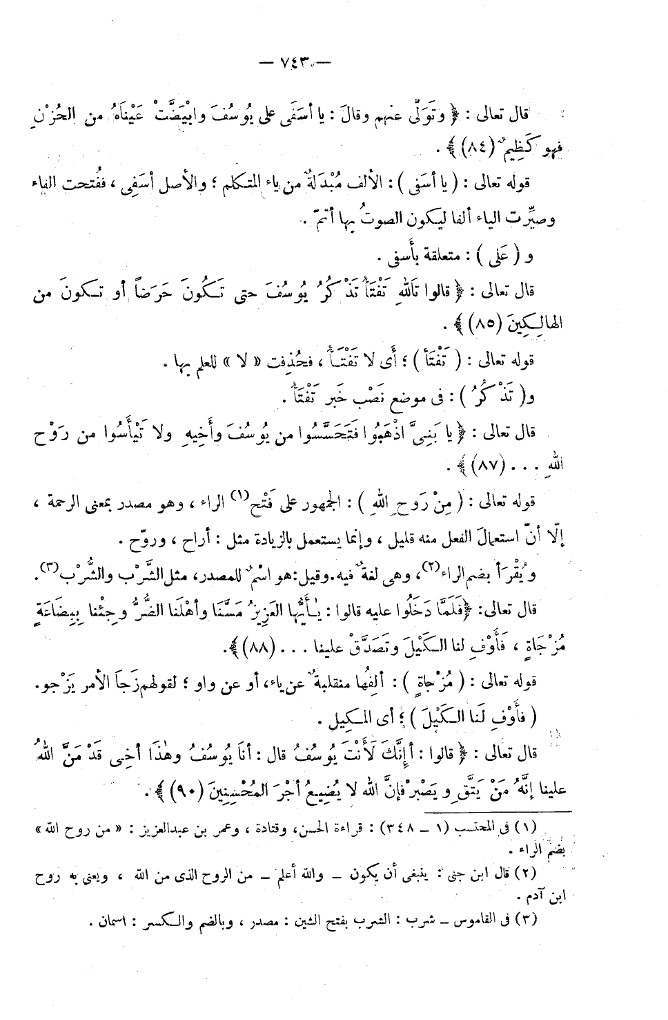 قَوْلُهُ تَعَالَى: (يَا أَسَفَى) : الْأَلِفُ مُبْدَلَةٌ مِنْ يَاءِ الْمُتَكَلِّمِ وَالْأَصْلُ أَسَفِي فَفُتِحَتِ الْفَاءُ وَصُيِّرَتِ الْيَاءُ أَلِفًا لِيَكُونَ الصَّوْتُ بِهَا أَتَمَّ.
