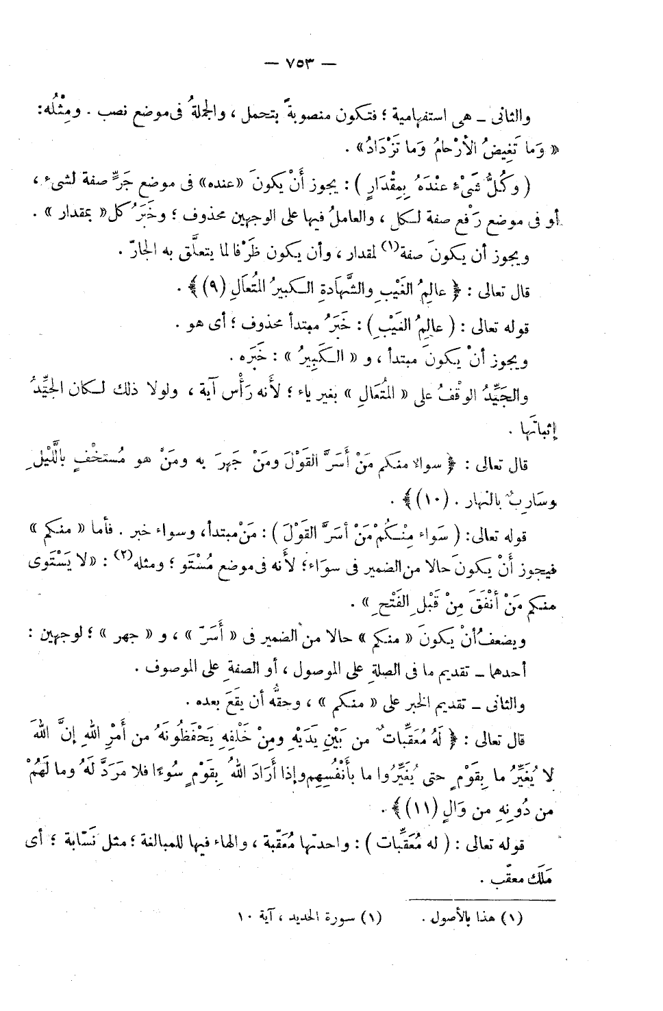 قَوْلُهُ تَعَالَى: (سَوَاءٌ مِنْكُمْ مَنْ أَسَرَّ الْقَوْلَ) : «مَنْ» مُبْتَدَأٌ، وَ «سَوَاءٌ» خَبَرٌ. فَأَمَّا «مِنْكُمْ» فَيَجُوزُ أَنْ يَكُونَ حَالًا مِنَ الضَّمِيرِ فِي «سَوَاءٌ» ; لِأَنَّهُ فِي مَوْضِعٍ مُسْتَوٍ ; وَمِثْلُهُ: (لَا يَسْتَوِي مِنْكُمْ مَنْ أَنْفَقَ مِنْ قَبْلِ الْفَتْحِ) [الْحَدِيدُ: 10] .
