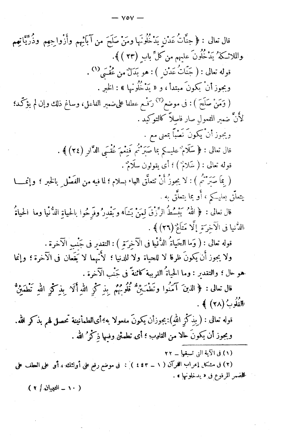 قَوْلُهُ تَعَالَى: (جَنَّاتُ عَدْنٍ) : هُوَ بَدَلٌ مِنْ «عُقْبَى» وَيَجُوزُ أَنْ يَكُونَ مُبْتَدَأً، وَ «يَدْخُلُونَهَا» الْخَبَرُ.