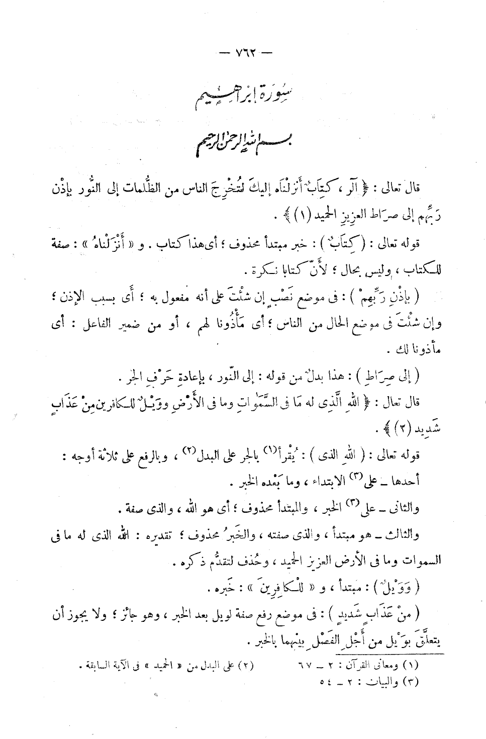 قَوْلُهُ تَعَالَى: (كِتَابٌ) : خَبَرُ مُبْتَدَأٍ مَحْذُوفٍ ; أَيْ هَذَا كِتَابٌ. وَ «أَنْزَلْنَاهُ» : صِفَةٌ لِلْكِتَابِ وَلَيْسَ بِحَالٍ ; لِأَنَّ كِتَابًا نَكِرَةٌ. (بِإِذْنِ رَبِّهِمْ) : فِي مَوْضِعِ نَصْبٍ؛ إِنْ شِئْتَ عَلَى أَنَّهُ مَفْعُولٌ بِهِ ; أَيْ بِسَبَبِ الْإِذْنِ، وَإِنْ شِئْتَ فِي مَوْضِعِ الْحَالِ مِنَ النَّاسِ ; أَيْ مَأْذُونًا لَهُمْ، أَوْ مِنْ ضَمِيرِ الْفَاعِلِ ; أَيْ مَأْذُونًا لَكَ. (إِلَى صِرَاطِ) : هَذَا بَدَلٌ مِنْ قَوْلِهِ: إِلَى النُّورِ، بِإِعَادَةِ حَرْفِ الْجَرِّ.