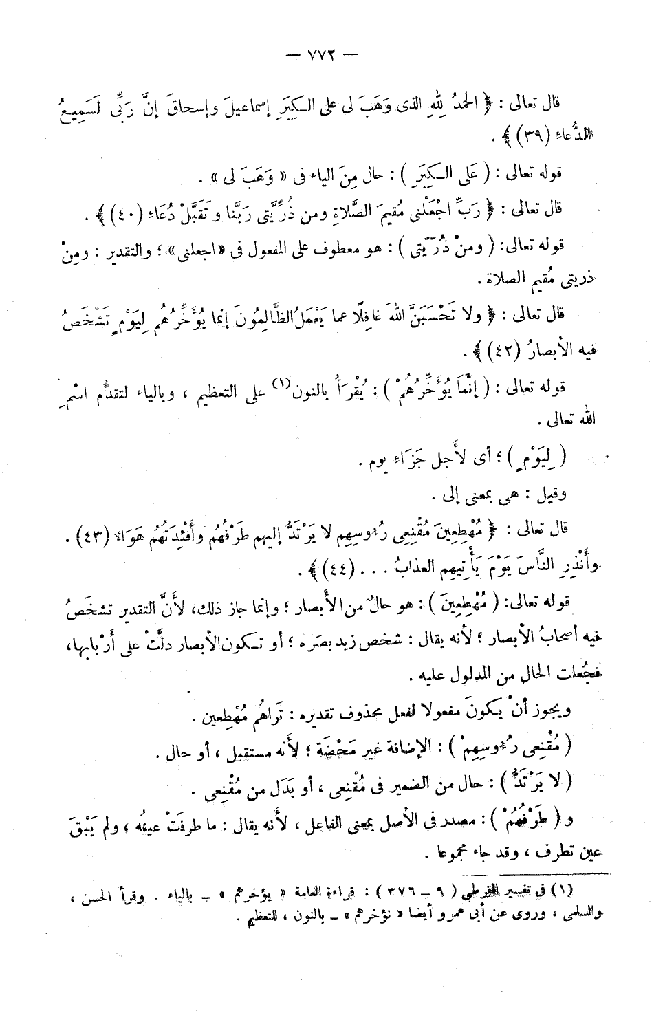 (مُقْنِعِي رُءُوسِهِمْ) : الْإِضَافَةُ غَيْرُ مَحْضَةٍ ; لِأَنَّهُ مُسْتَقْبَلٌ أَوْ حَالٌ. (لَا يَرْتَدُّ) : حَالٌ مِنَ الضَّمِيرِ فِي مُقْنِعِي، أَوْ بَدَلٌ مِنْ مُقْنِعِي، وَ (طَرْفُهُمْ) : مَصْدَرٌ فِي الْأَصْلِ بِمَعْنَى الْفَاعِلِ ; لِأَنَّهُ يُقَالُ: مَا طَرَفَتْ عَيْنُهُ، وَلَمْ يَبْقَ عَيْنٌ تَطْرُفُ، وَقَدْ جَاءَ مَجْمُوعًا. وَ (