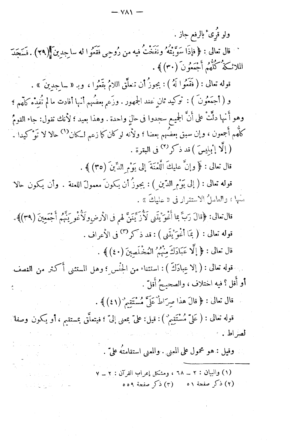 وَ (أَجْمَعُونَ) : تَوْكِيدٌ ثَانٍ عِنْدِ الْجُمْهُورِ. وَزَعَمَ بَعْضُهُمْ أَنَّهَا أَفَادَتْ مَا لَمْ تُفِدْهُ «كُلُّهُمْ» ; وَهُوَ أَنَّهَا دَلَّتْ عَلَى أَنَّ الْجَمِيعَ سَجَدُوا فِي حَالٍ وَاحِدَةٍ. وَهَذَا بَعِيدٌ ; لِأَنَّكَ تَقُولُ: جَاءَ الْقَوْمُ كُلُّهُمْ أَجْمَعُونَ، وَإِنْ سَبَقَ بَعْضُهُمْ بَعْضًا ; وَلِأَنَّهُ لَوْ كَانَ كَمَا زُعِمَ لَكَانَ حَالًا لَا تَوْكِيدًا.
