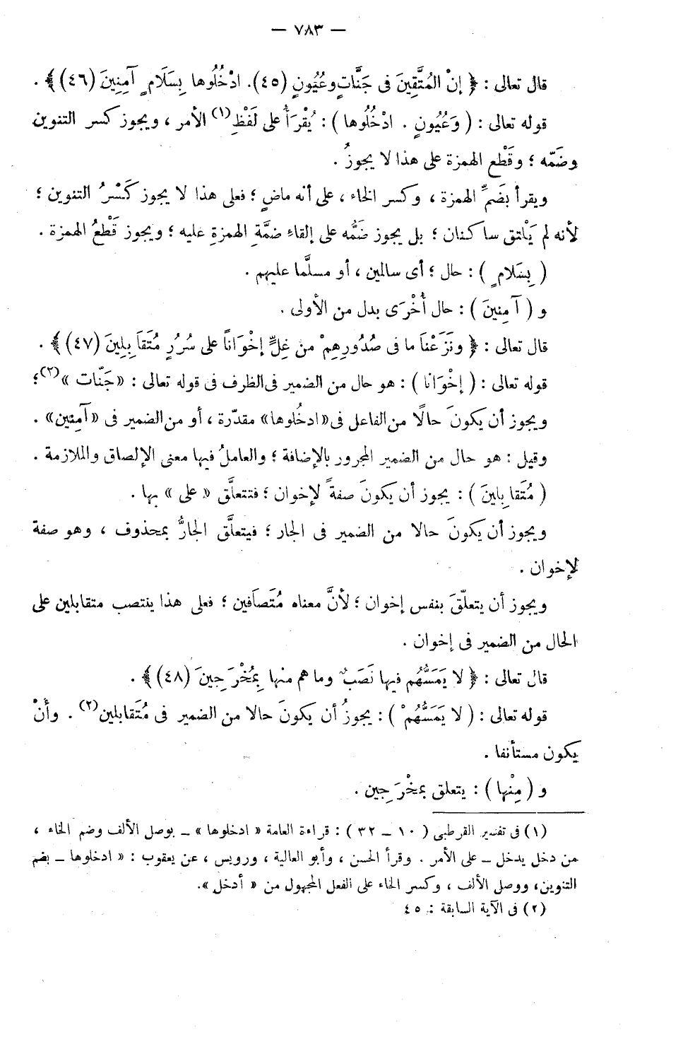 (مُتَقَابِلِينَ) : يَجُوزُ أَنْ يَكُونَ صِفَةً لِإِخْوَانٍ ; فَتَتَعَلَّقُ «عَلَى» بِهَا.