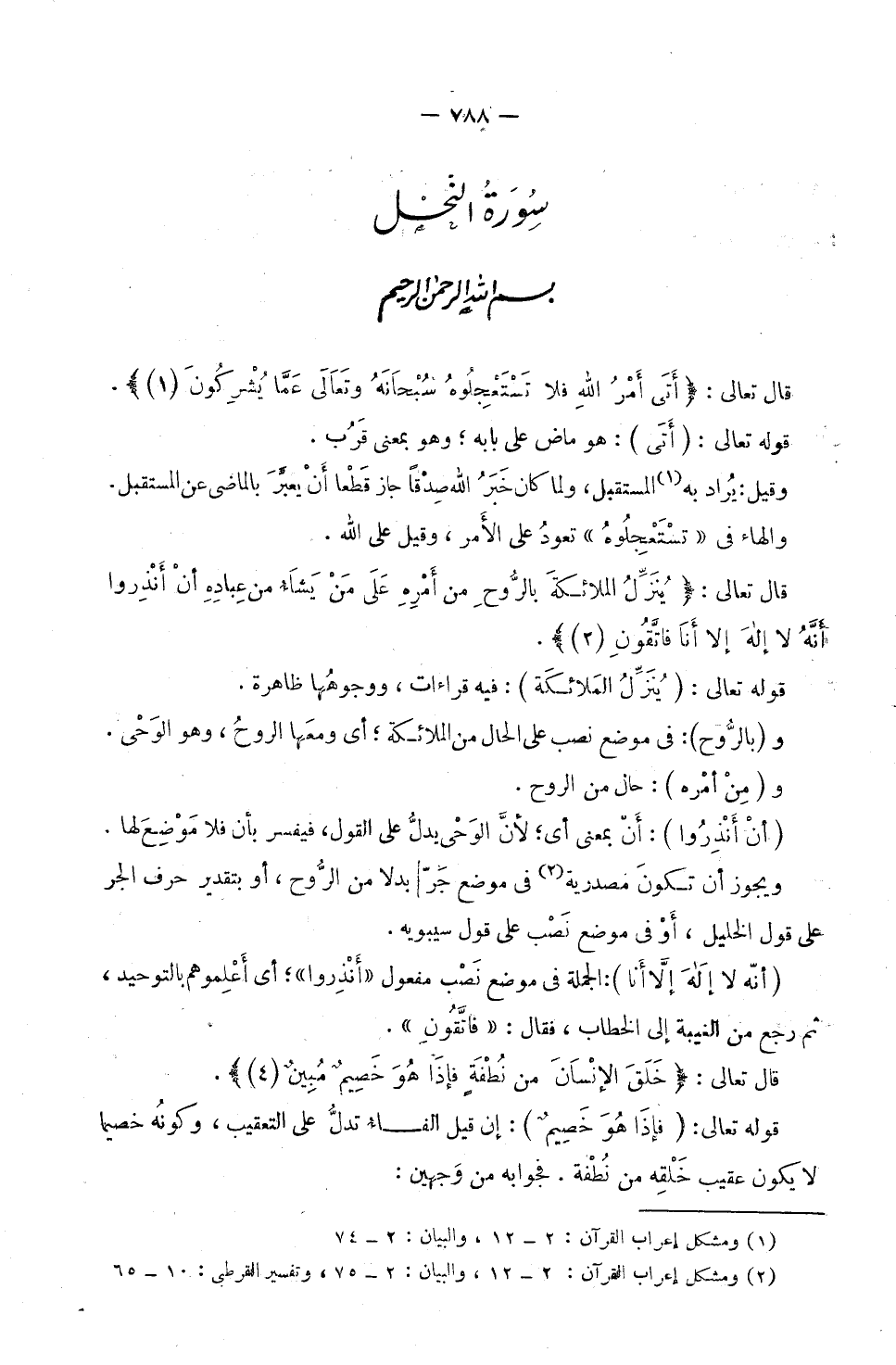 قَالَ تَعَالَى: (يُنَزِّلُ الْمَلَائِكَةَ بِالرُّوحِ مِنْ أَمْرِهِ عَلَى مَنْ يَشَاءُ مِنْ عِبَادِهِ أَنْ أَنْذِرُوا أَنَّهُ لَا إِلَهَ إِلَّا أَنَا فَاتَّقُونِ (2)) .