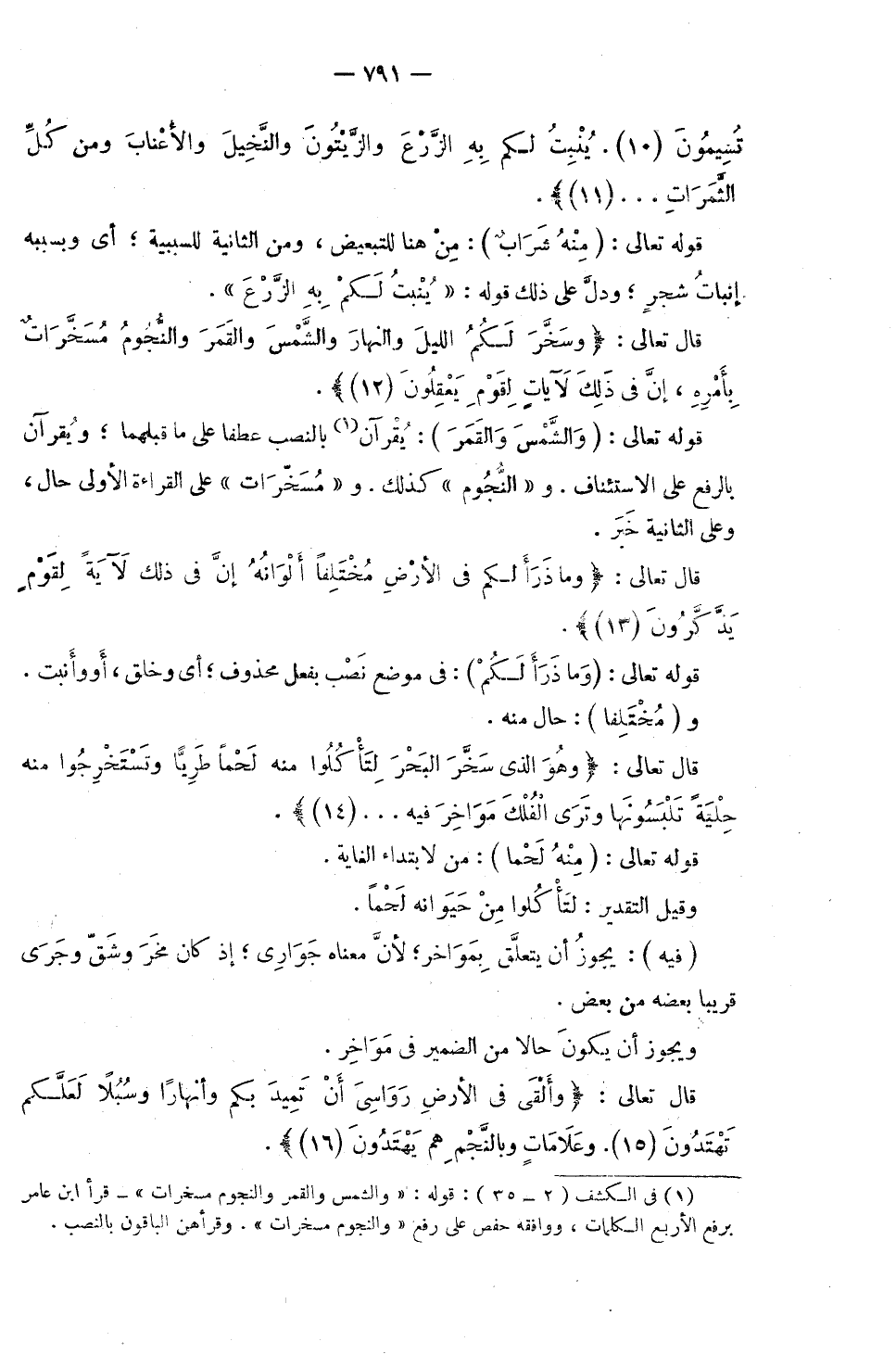 قَوْلُهُ تَعَالَى: (وَالشَّمْسَ وَالْقَمَرَ) : يُقْرَآنِ بِالنَّصْبِ عَطْفًا عَلَى مَا قَبْلَهُمَا ; وَيُقْرَآنِ بِالرَّفْعِ عَلَى الِاسْتِئْنَافِ. وَ «النُّجُومُ» كَذَلِكَ. وَ «مُسَخَّرَاتٌ» عَلَى الْقِرَاءَةِ الْأُولَى حَالٌ، وَعَلَى الثَّانِيَةِ خَبَرٌ.