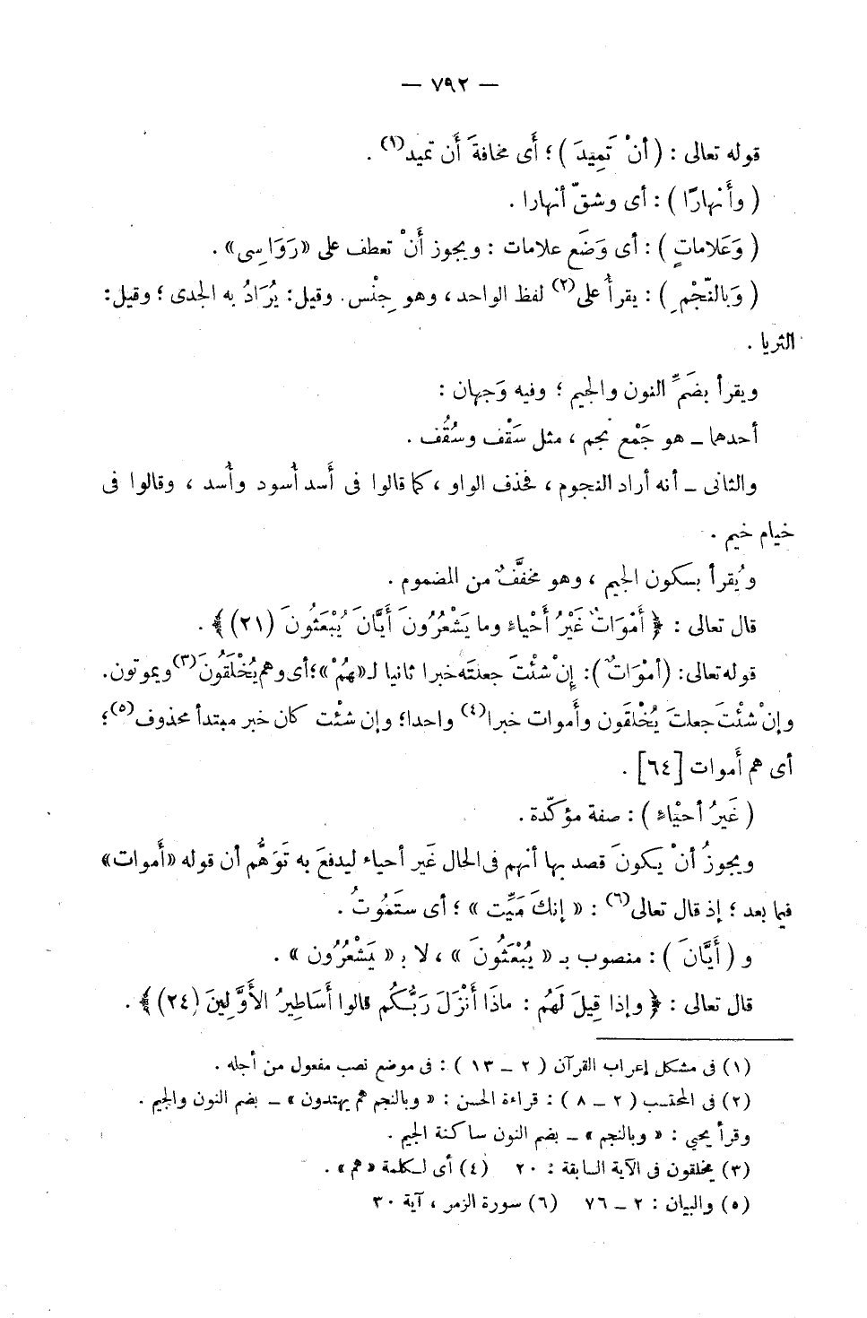 هُوَ جَمْعُ نَجْمٍ، مِثْلَ سَقْفٍ وَسُقُفٍ. وَالثَّانِي: أَنَّهُ أَرَادَ النُّجُومَ، فَحَذَفَ الْوَاوَ، كَمَا قَالُوا فِي أَسَدٍ: أُسُودٌ وَأُسُدٌ، وَقَالُوا فِي خِيَامٍ: خِيَمٌ.