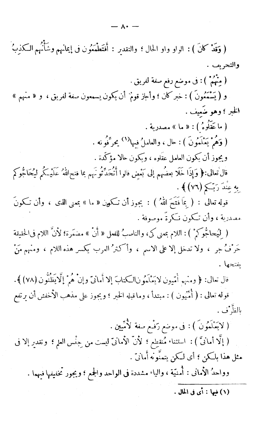 قَوْلُهُ تَعَالَى: (أُمِّيُّونَ) : مُبْتَدَأٌ، وَمَا قَبْلَهُ الْخَبَرُ، وَيَجُوزُ عَلَى مَذْهَبِ الْأَخْفَشِ أَنْ يَرْتَفِعَ بِالظَّرْفِ. (لَا يَعْلَمُونَ) : فِي مَوْضِعِ رَفْعٍ صِفَةٌ لِأُمِّيِّينَ.