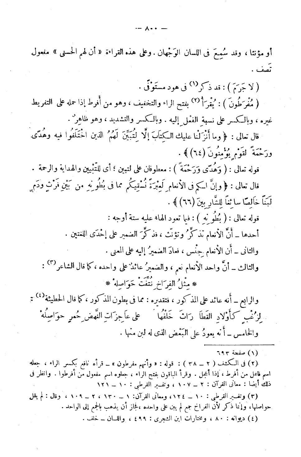 قَوْلُهُ تَعَالَى: (بُطُونِهِ) : فِيمَا تَعُودُ الْهَاءُ عَلَيْهِ سِتَّةُ أَوْجُهٍ ; أَحَدُهَا: أَنَّ الْأَنْعَامَ تُذَكَّرُ وَتُؤَنَّثُ، فَذُكِّرَ الضَّمِيرُ عَلَى إِحْدَى اللُّغَتَيْنِ. وَالثَّانِي: أَنَّ الْأَنْعَامَ جِنْسٌ، فَعَادَ الضَّمِيرُ إِلَيْهِ عَلَى الْمَعْنَى. وَالثَّالِثُ: أَنَّ وَاحِدَ الْأَنْعَامِ نَعَمٌ، وَالضَّمِيرُ عَائِدٌ عَلَى وَاحِدِهِ، كَمَا قَالَ الشَّاعِرُ:
