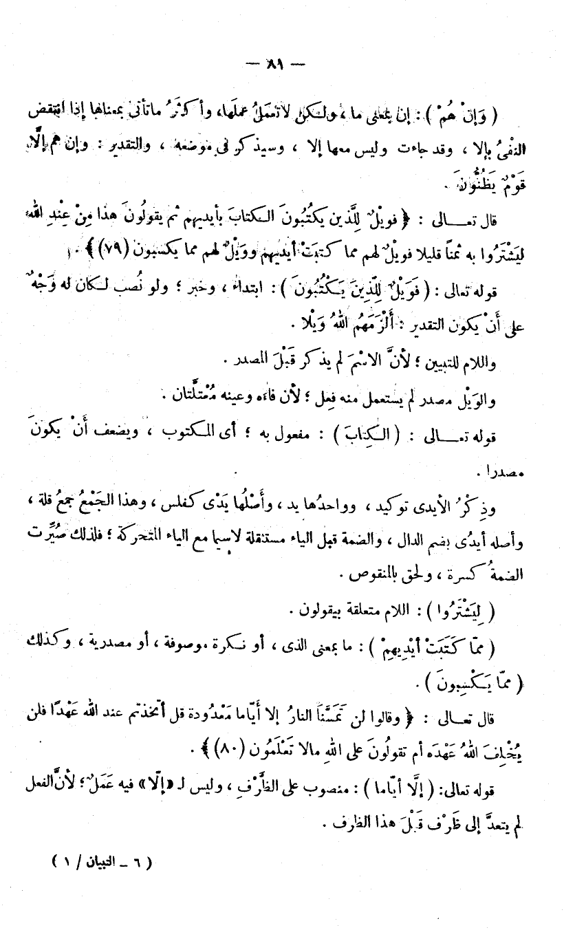 قَوْلُهُ تَعَالَى: (الْكِتَابَ) : مَفْعُولٌ بِهِ ; أَيِ الْمَكْتُوبَ وَيَضْعُفُ أَنْ يَكُونَ مَصْدَرًا، وَذِكْرُ الْأَيْدِي تَوْكِيدٌ، وَوَاحِدُهَا يَدٌ، وَأَصْلُهَا يَدْيٌ كَفَلْسٍ، وَهَذَا الْجَمْعُ جَمْعُ قِلَّةٍ وَأَصْلُهُ أَيْدُيٌ بِضَمِّ الدَّالِ، وَالضَّمَّةُ قَبْلَ الْيَاءِ مُسْتَثْقَلَةٌ لَا سِيَّمَا مَعَ الْيَاءِ الْمُتَحَرِّكَةِ، فَلِذَلِكَ صُيِّرَتِ الضَّمَّةُ كَسْرَةً، وَلَحِقَ بِالْمَنْقُوصِ. (لِيَشْتَرُوا) : اللَّامُ مُتَعَلِّقَةٌ بِـ (يَقُولُونَ) (مِمَّا كَتَبَتْ أَيْدِيهِمْ) : مَا بِمَعْنَى الَّذِي، أَوْ نَكِرَةٌ مَوْصُوفَةٌ أَوْ مَصْدَرِيَّةٌ وَكَذَلِكَ (مِمَّا يَكْسِبُونَ) .