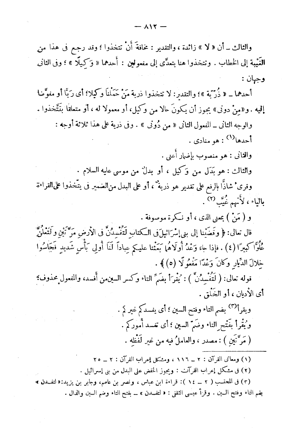 وَالثَّالِثُ: أَنَّ «لَا» زَائِدَةٌ، وَالتَّقْدِيرُ: مَخَافَةَ أَنْ تَتَّخِذُوا ; وَقَدْ رَجَعَ فِي هَذَا مِنَ الْغَيْبَةِ إِلَى الْخِطَابِ. وَ «تَتَّخِذُوا» هُنَا يَتَعَدَّى إِلَى مَفْعُولَيْنِ: أَحَدُهُمَا: «وَكِيلًا» وَفِي الثَّانِي وَجْهَانِ ; أَحَدُهُمَا: «ذَرِّيَّةَ» وَالتَّقْدِيرُ: لَا تَتَّخِذُوا ذَرِّيَّةَ مَنْ حَمَلْنَا وَكِيلًا ; أَيْ رَبًّا أَوْ مُفَوَّضًا إِلَيْهِ. وَ «مِنْ دُونِي» يَجُوزُ أَنْ يَكُونَ حَالًا مِنْ وَكِيلٍ، أَوْ مَعْمُولًا لَهُ، أَوْ مُتَعَلِّقًا بِتَتَّخِذُوا. وَالْوَجْهُ الثَّانِي: الْمَفْعُولُ الثَّانِي «مِنْ دُونِي» . وَفِي ذَرِّيَّةٍ عَلَى هَذَا ثَلَاثَةُ أَوْجُهٍ ; أَحَدُهَا: هُوَ مُنَادًى، وَالثَّانِي: هُوَ مَنْصُوبٌ بِإِضْمَارِ أَعْنِي. وَالثَّالِثُ: هُوَ بَدَلٌ مِنْ وَكِيلٍ، أَوْ بَدَلٌ مِنْ مُوسَى عَلَيْهِ السَّلَامُ.