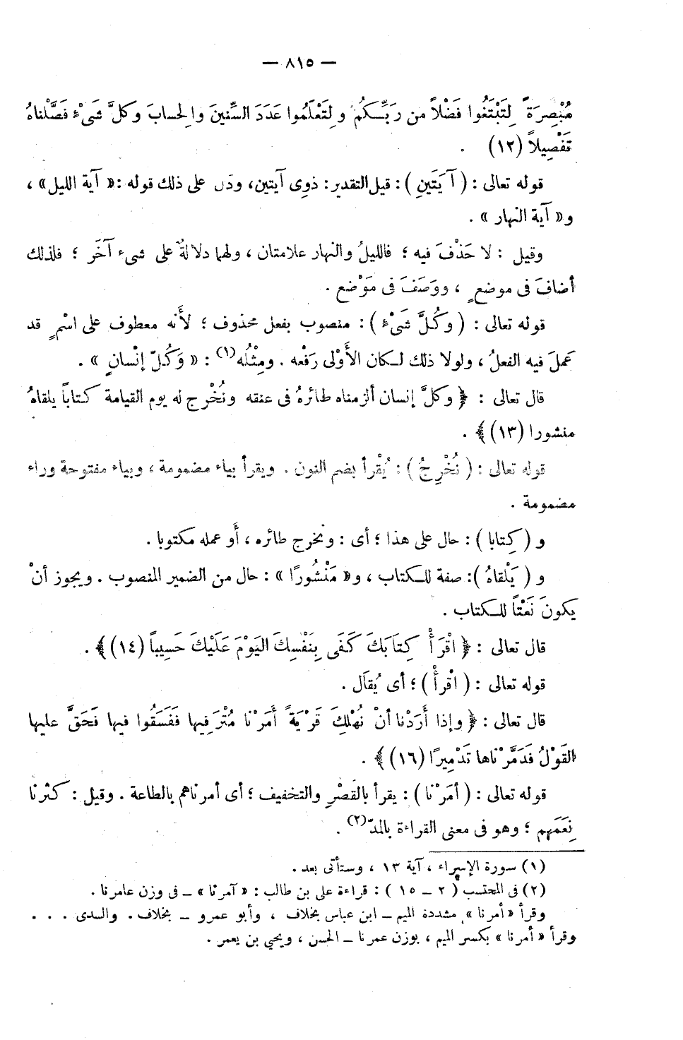 قَوْلُهُ تَعَالَى: (أَمَرْنَا) : يُقْرَأُ بِالْقَصْرِ وَالتَّخْفِيفِ ; أَيْ أَمَرْنَاهُمْ بِالطَّاعَةِ. وَقِيلَ: كَثَّرْنَا نِعَمَهُمْ وَهُوَ فِي مَعْنَى الْقِرَاءَةِ بِالْمَدِّ.