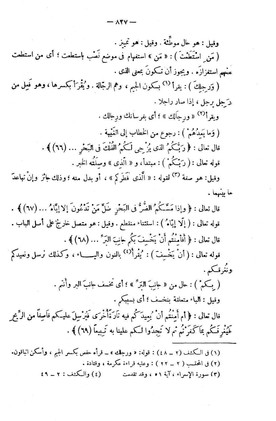 (وَرَجِلِكَ) : يُقْرَأُ بِسُكُونِ الْجِيمِ، وَهُمُ الرَّجَّالَةُ. وَيُقْرَأُ بِكَسْرِهَا، وَهُوَ فَعِلٌ مِنْ رَجِلَ يَرْجَلُ، إِذَا صَارَ رَاجِلًا.