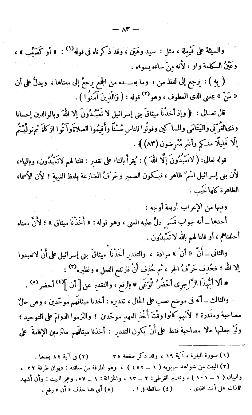 قَوْلُهُ تَعَالَى: (لَا تَعْبُدُونَ إِلَّا اللَّهَ) : يُقْرَأُ بِالتَّاءِ عَلَى تَقْدِيرِ: قُلْنَا لَهُمْ لَا تَعْبُدُونَ، وَبِالْيَاءِ ; لِأَنَّ بَنِي إِسْرَائِيلَ اسْمٌ ظَاهِرٌ، فَيَكُونُ الضَّمِيرُ وَحَرْفُ الْمُضَارَعَةِ بِلَفْظِ الْغَيْبَةِ ; لِأَنَّ الْأَسْمَاءَ الظَّاهِرَةَ كُلَّهَا غَيْبٌ، وَفِيهَا مِنَ الْإِعْرَابِ أَرْبَعَةُ أَوْجُهٍ: