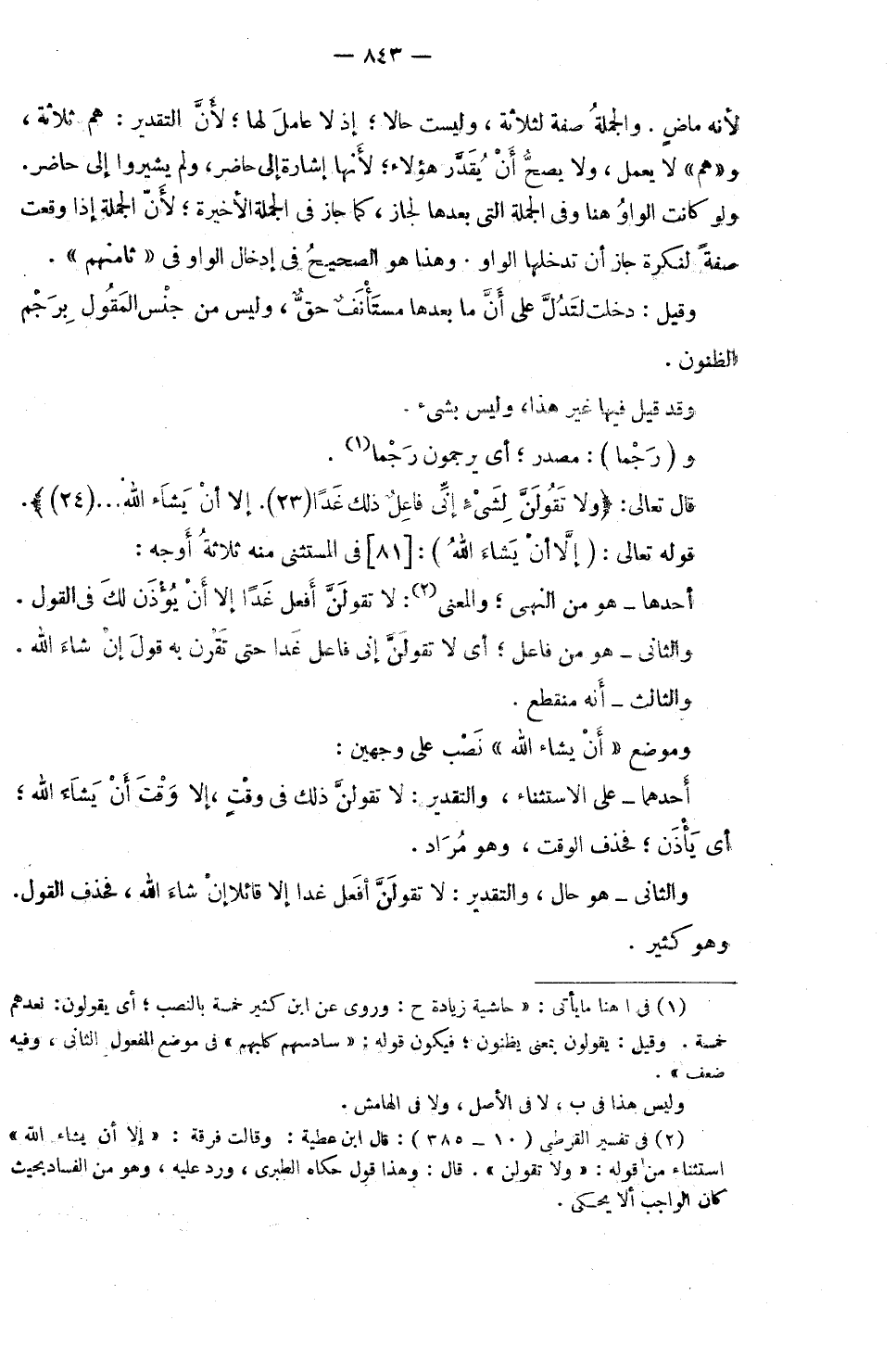 قَوْلُهُ تَعَالَى: (إِلَّا أَنْ يَشَاءَ اللَّهُ) : فِي الْمُسْتَثْنَى مِنْهُ ثَلَاثَةُ أَوْجُهٍ ; أَحَدُهَا: هُوَ مِنَ النَّهْيِ، وَالْمَعْنَى: لَا تَقُولَنَّ: أَفْعَلُ غَدًا، إِلَّا أَنْ يُؤْذَنَ لَكَ فِي الْقَوْلِ. وَالثَّانِي: هُوَ مِنْ فَاعِلٍ ; أَيْ لَا تَقُولَنَّ: إِنِّي فَاعِلٌ غَدًا، حَتَّى تَقْرِنَ بِهِ قَوْلَ: إِنْ شَاءَ اللَّهُ. وَالثَّالِثُ: أَنَّهُ مُنْقَطِعٌ.