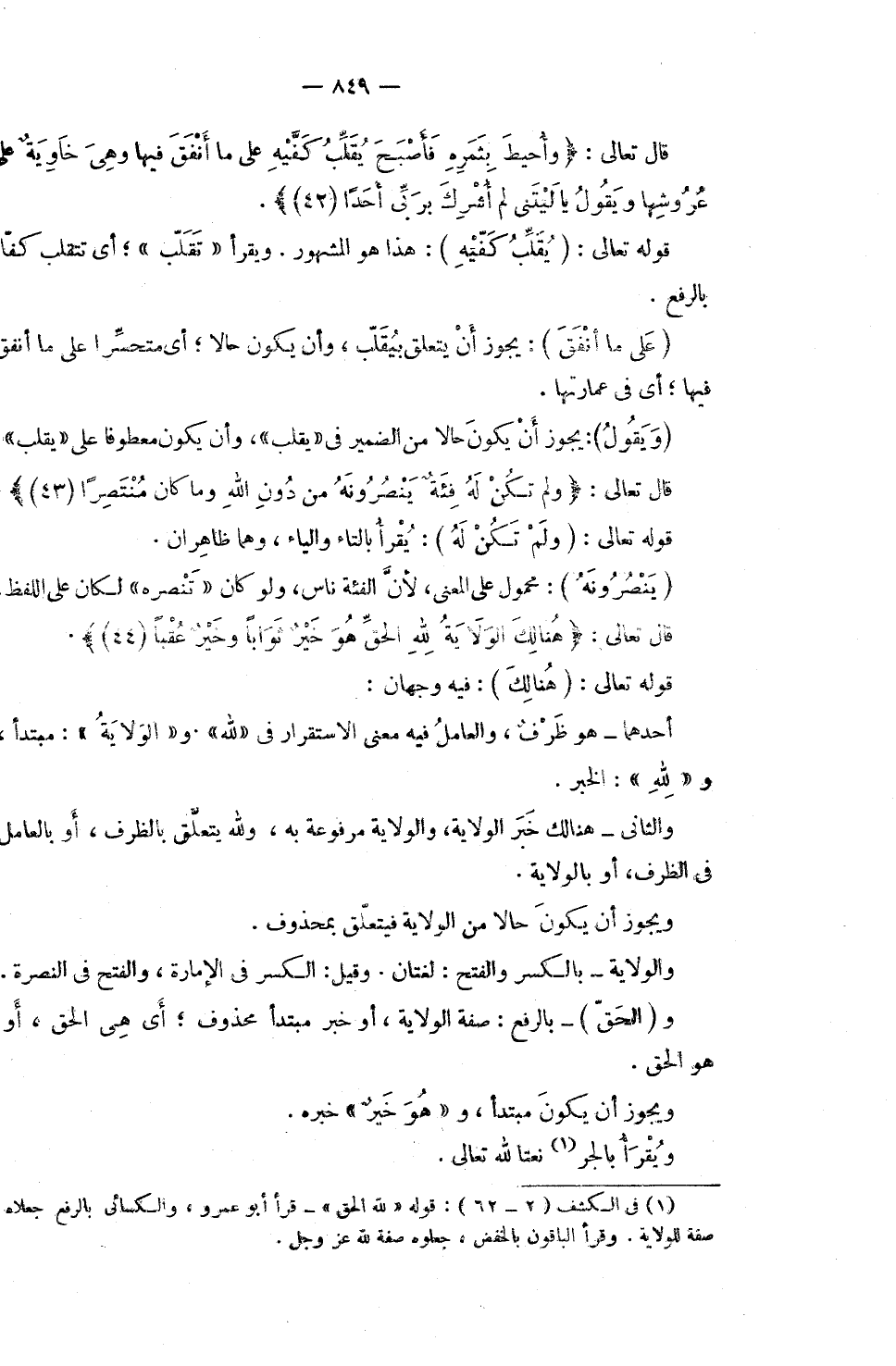 قَوْلُهُ تَعَالَى: (يُقَلِّبُ كَفَّيْهِ) : هَذَا هُوَ الْمَشْهُورُ. وَيُقْرَأُ «تَقَلَّبُ» أَيْ تَتَقَلَّبُ كَفَّاهُ بِالرَّفْعِ.