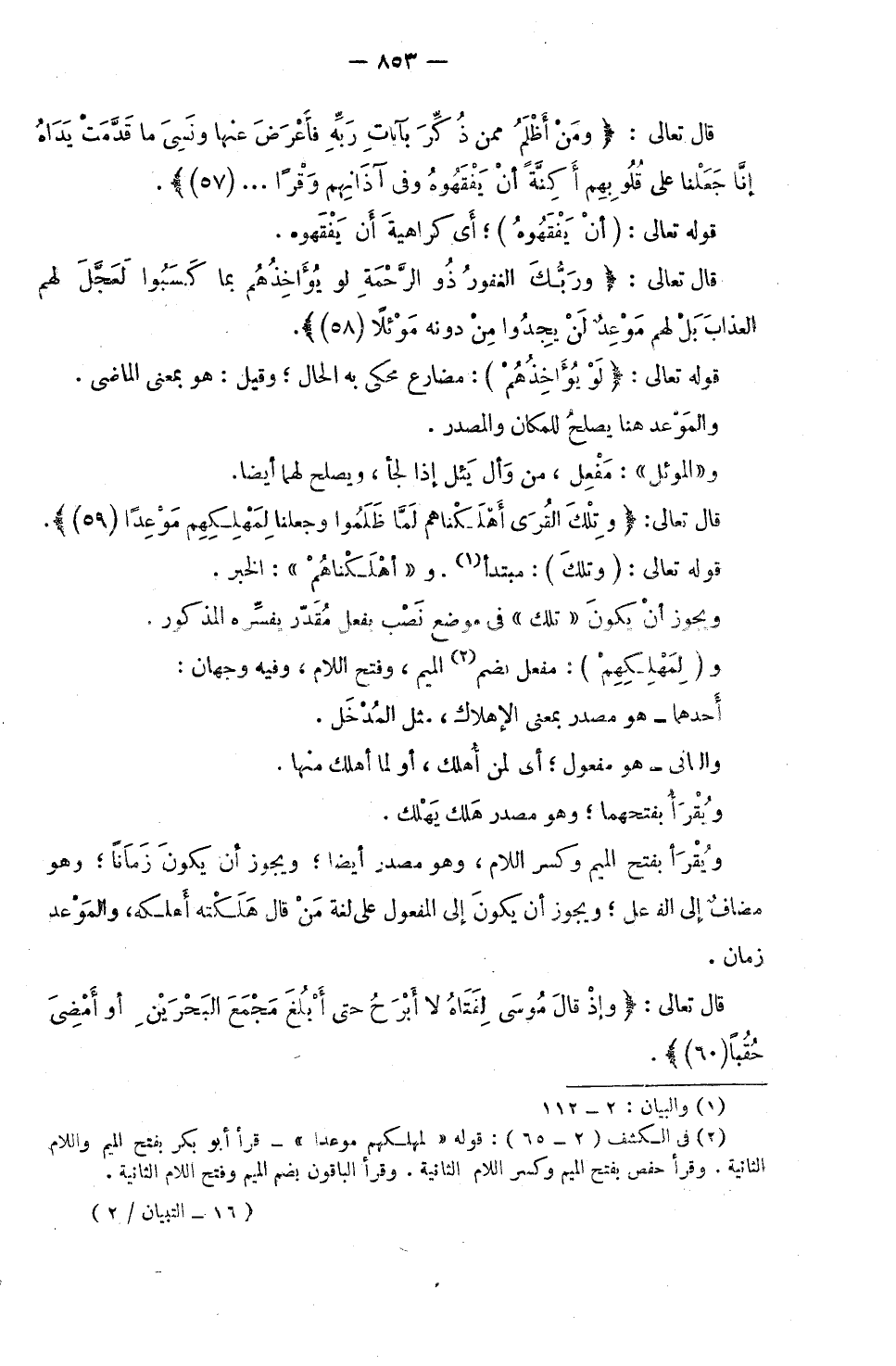 قَوْلُهُ تَعَالَى: (وَتِلْكَ) : مُبْتَدَأٌ، وَ «أَهْلَكْنَاهُمْ» الْخَبَرُ. وَيَجُوزُ أَنْ يَكُونَ «تِلْكَ» فِي مَوْضِعِ نَصْبٍ بِفِعْلٍ مُقَدَّرٍ يُفَسِّرُهُ الْمَذْكُورُ. وَ (لِمَهْلِكِهِمْ) : مَفْعِلٌ بِضَمِّ الْمِيمِ، وَفَتْحِ اللَّامِ، وَفِيهِ وَجْهَانِ: