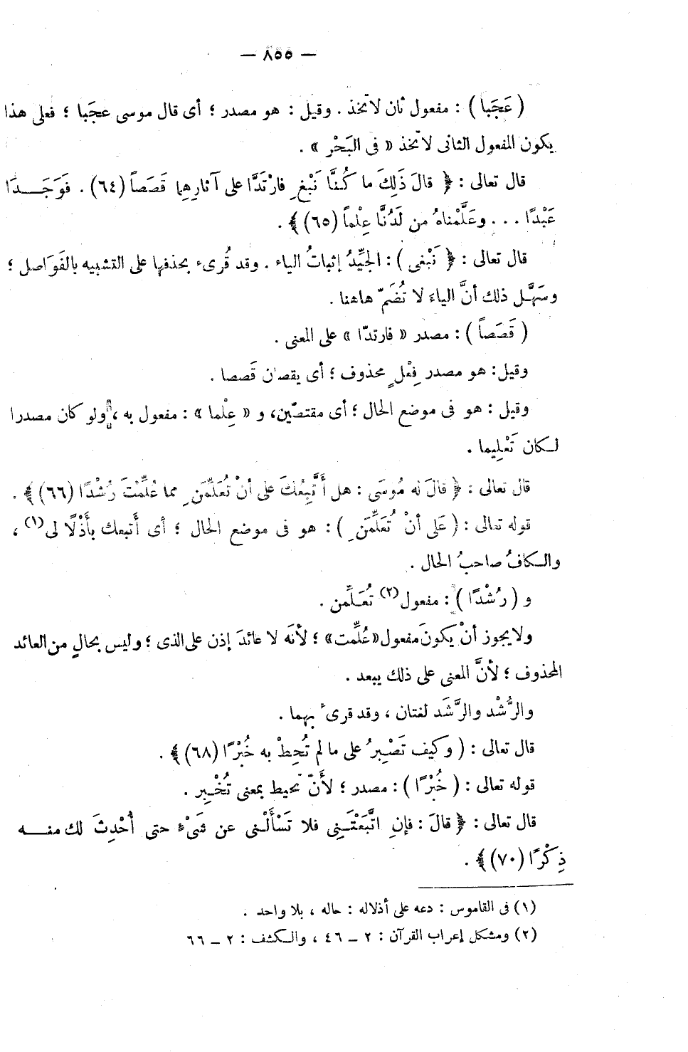 (قَصَصًا) : مَصْدَرُ «فَارْتَدَّا» عَلَى الْمَعْنَى. وَقِيلَ: هُوَ مَصْدَرُ فِعْلٍ مَحْذُوفٍ ; أَيْ يَقُصَّانِ قَصَصًا. وَقِيلَ: هُوَ فِي مَوْضِعِ الْحَالِ ; أَيْ مُقْتَصِّينَ، وَ «عِلْمًا» : مَفْعُولٌ بِهِ، وَلَوْ كَانَ مَصْدَرًا لَكَانَ تَعْلِيمًا.