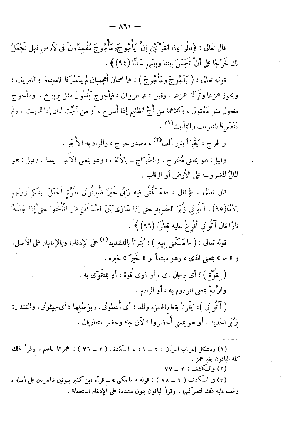(بِقُوَّةٍ) : أَيْ بِرِجَالٍ ذِي - أَوْ ذَوِي - قُوَّةٍ، أَوْ بِمُتَقَوًّى بِهِ. وَالرَّدْمُ بِمَعْنَى الْمَرْدُومِ بِهِ، أَوِ الرَّادِمِ. (آتُونِي) : يُقْرَأُ بِقَطْعِ الْهَمْزَةِ وَالْمَدِّ ; أَيْ أَعْطُونِي. وَبِوَصْلِهَا ; أَيْ جِئُونِي. وَالتَّقْدِيرُ: بِزُبَرِ الْحَدِيدِ. أَوْ هُوَ بِمَعْنَى أَحْضِرُوا ; لِأَنَّ جَاءَ وَحَضَرَ مُتَقَارِبَانِ