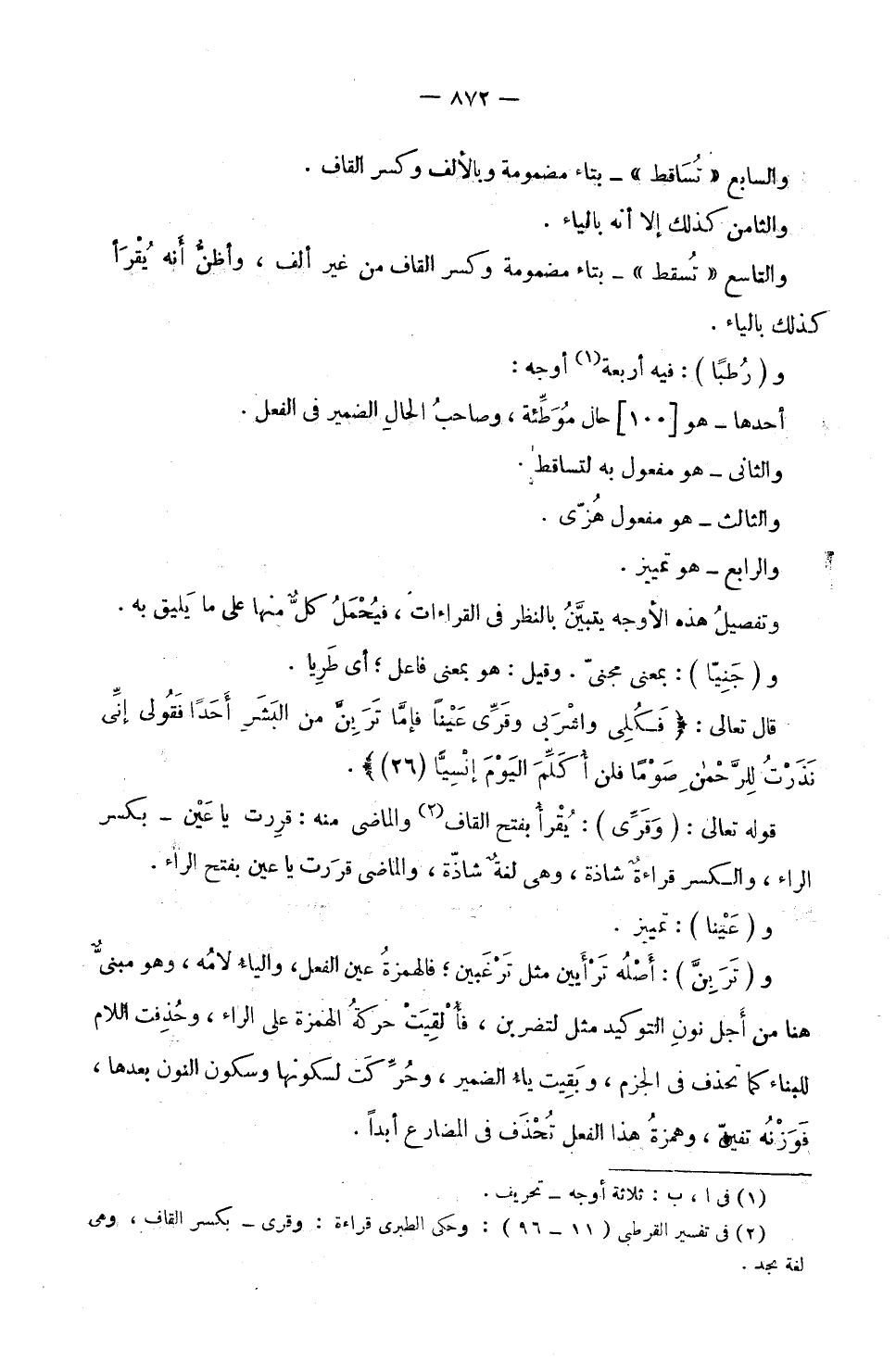 وَ (رُطَبًا) : فِيهِ أَرْبَعَةُ أَوْجُهٍ: أَحَدُهَا: هُوَ حَالٌ مُوَطِّئَةٌ، وَصَاحِبُ الْحَالِ الضَّمِيرُ فِي الْفِعْلِ. وَالثَّانِي: هُوَ مَفْعُولٌ بِهِ لِتُسَاقِطْ. وَالثَّالِثُ: هُوَ مَفْعُولُ هُزِّي. وَالرَّابِعُ: هُوَ تَمْيِيزٌ. وَتَفْصِيلُ هَذِهِ الْأَوْجُهِ يَتَبَيَّنُ بِالنَّظَرِ فِي الْقِرَاءَاتِ، فَيُحْمَلُ كُلٌّ مِنْهَا عَلَى مَا يَلِيقُ بِهِ.