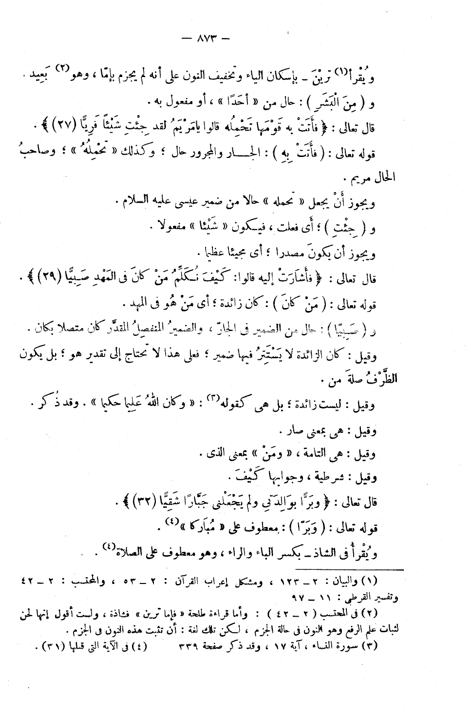 وَيُقْرَأُ تَرَيْنَ - بِإِسْكَانِ الْيَاءِ وَتَخْفِيفِ النُّونِ - عَلَى أَنَّهُ لَمْ يُجْزَمْ بِإِمَّا، وَهُوَ بَعِيدٌ.