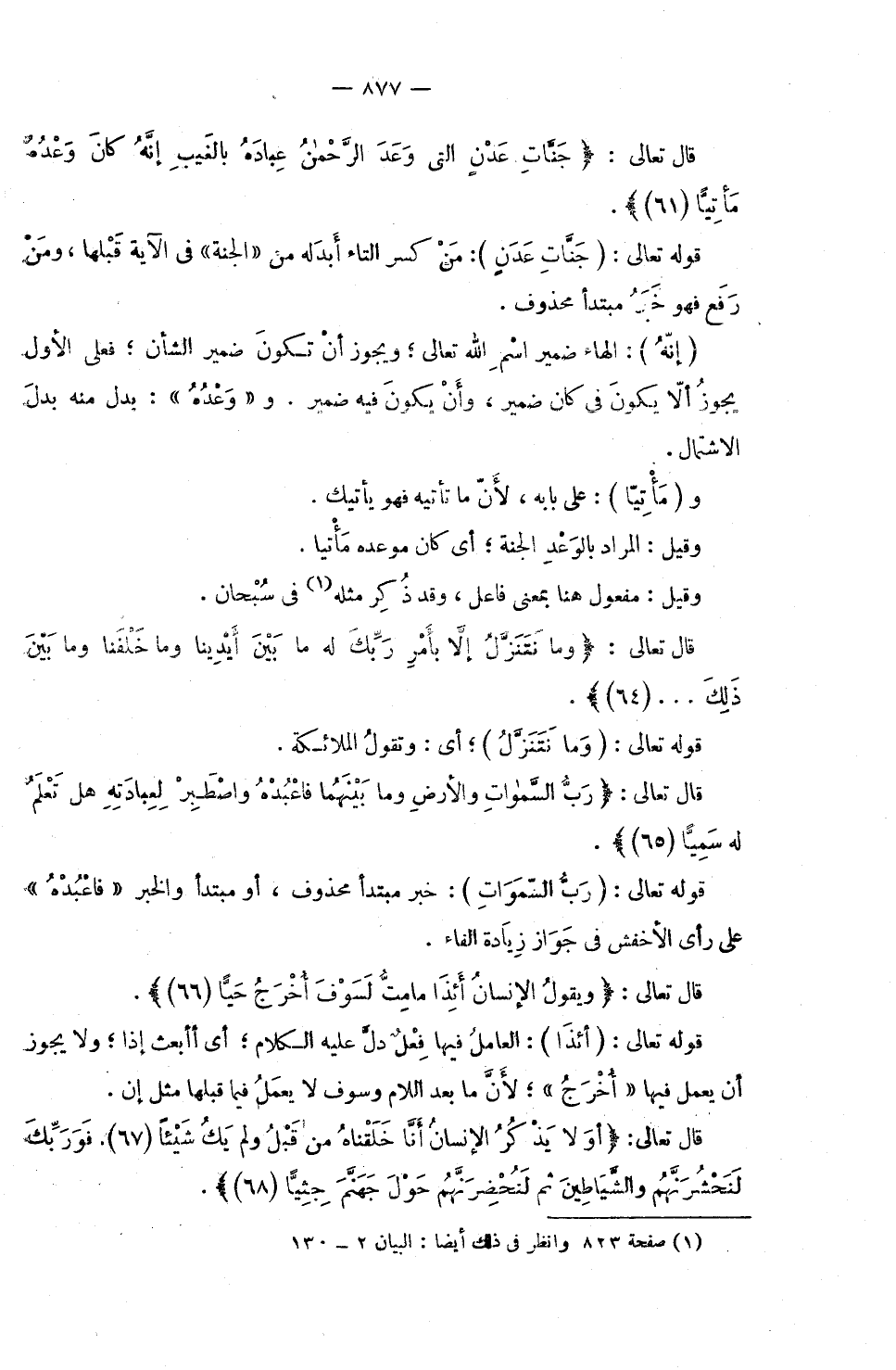 وَ (مَأْتِيًّا) : عَلَى بَابِهِ ; لِأَنَّ مَا تَأْتِيهِ فَهُوَ يَأْتِيكَ. وَقِيلَ: الْمُرَادُ بِالْوَعْدِ الْجَنَّةُ ; أَيْ كَانَ مَوْعِدُهُ مَأْتِيًّا. وَقِيلَ: مَفْعُولٌ هُنَا بِمَعْنَى فَاعِلٍ، وَقَدْ ذُكِرَ مِثْلُهُ فِي سُبْحَانَ.