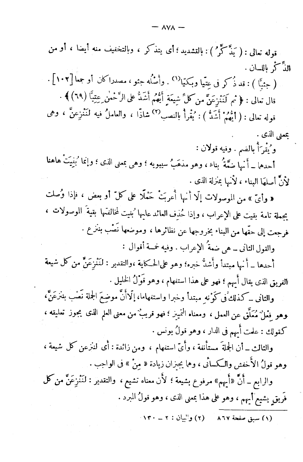 وَالثَّالِثُ: أَنَّ الْجُمْلَةَ مُسْتَأْنَفَةٌ، وَأَيُّ اسْتِفْهَامٌ، وَمِنْ زَائِدَةٌ: أَيْ لَنَنْزِعَنَّ كُلَّ شِيعَةٍ، وَهُوَ قَوْلُ الْأَخْفَشِ وَالْكِسَائِيِّ، وَهُمَا يُجِيزَانِ زِيَادَةَ «مِنْ» فِي الْوَاجِبِ.