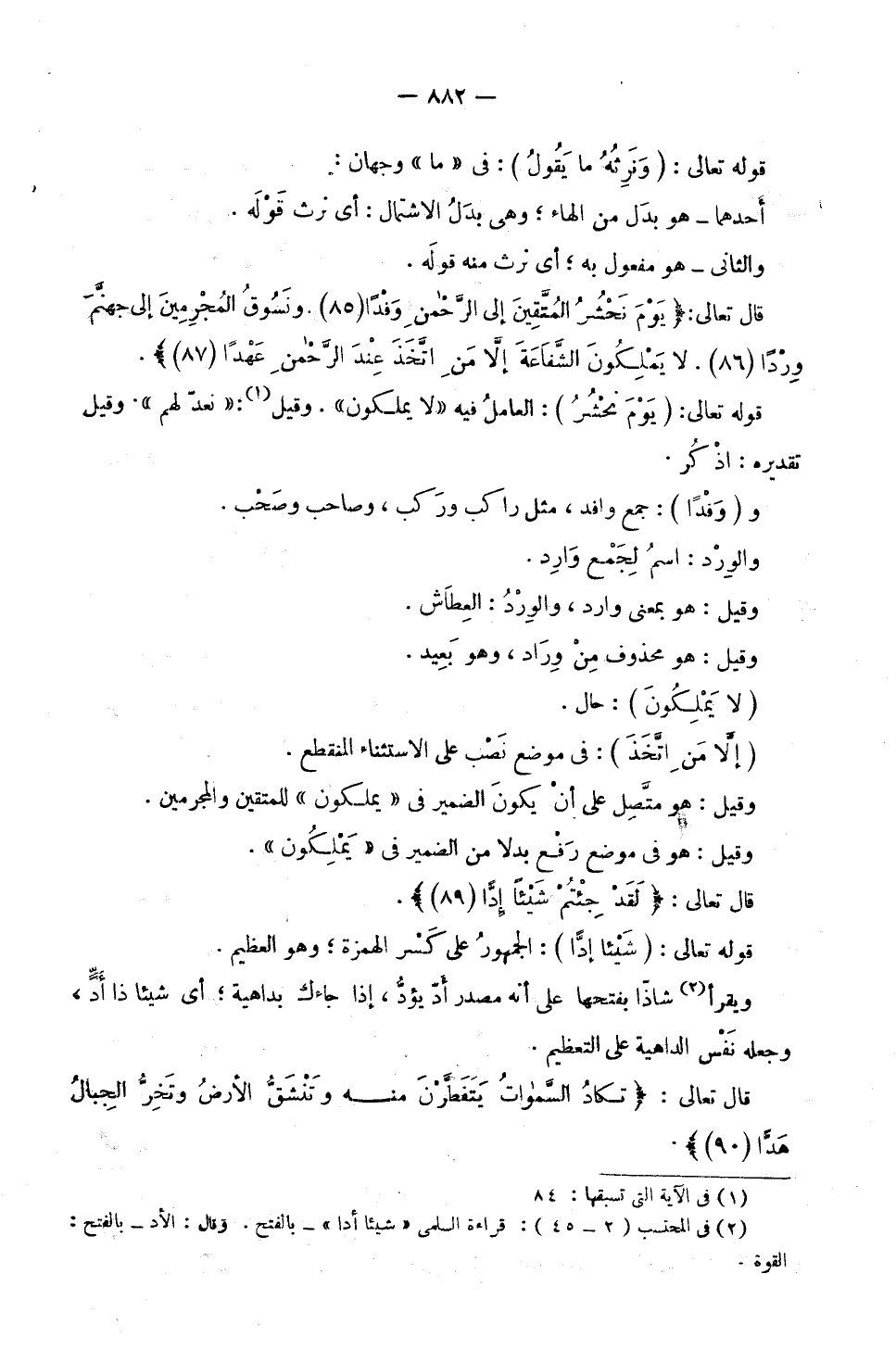 وَ (وَفْدًا) : جَمْعُ وَافِدٍ، مِثْلَ رَاكِبٍ وَرَكْبٍ، وَصَاحِبٍ وَصَحْبٍ. وَالْوِرْدُ: اسْمٌ لِجَمْعِ وَارِدٍ. وَقِيلَ: هُوَ بِمَعْنَى وَارِدٍ، وَالْوِرْدُ الْعِطَاشُ. وَقِيلَ: هُوَ مَحْذُوفٌ مِنْ وِرَادٍ، وَهُوَ بَعِيدٌ. (لَا يَمْلِكُونَ) : حَالٌ وَ (إِلَّا مَنِ اتَّخَذَ) : فِي مَوْضِعِ نَصْبٍ عَلَى الِاسْتِثْنَاءِ الْمُنْقَطِعِ. وَقِيلَ: هُوَ مُتَّصِلٌ عَلَى أَنْ يَكُونَ الضَّمِيرُ فِي «يَمْلِكُونَ» لِلْمُتَّقِينَ وَالْمُجْرِمِينَ. وَقِيلَ: هُوَ فِي مَوْضِعِ رَفْعٍ بَدَلًا مِنَ الضَّمِيرِ فِي «يَمْلِكُونَ» .