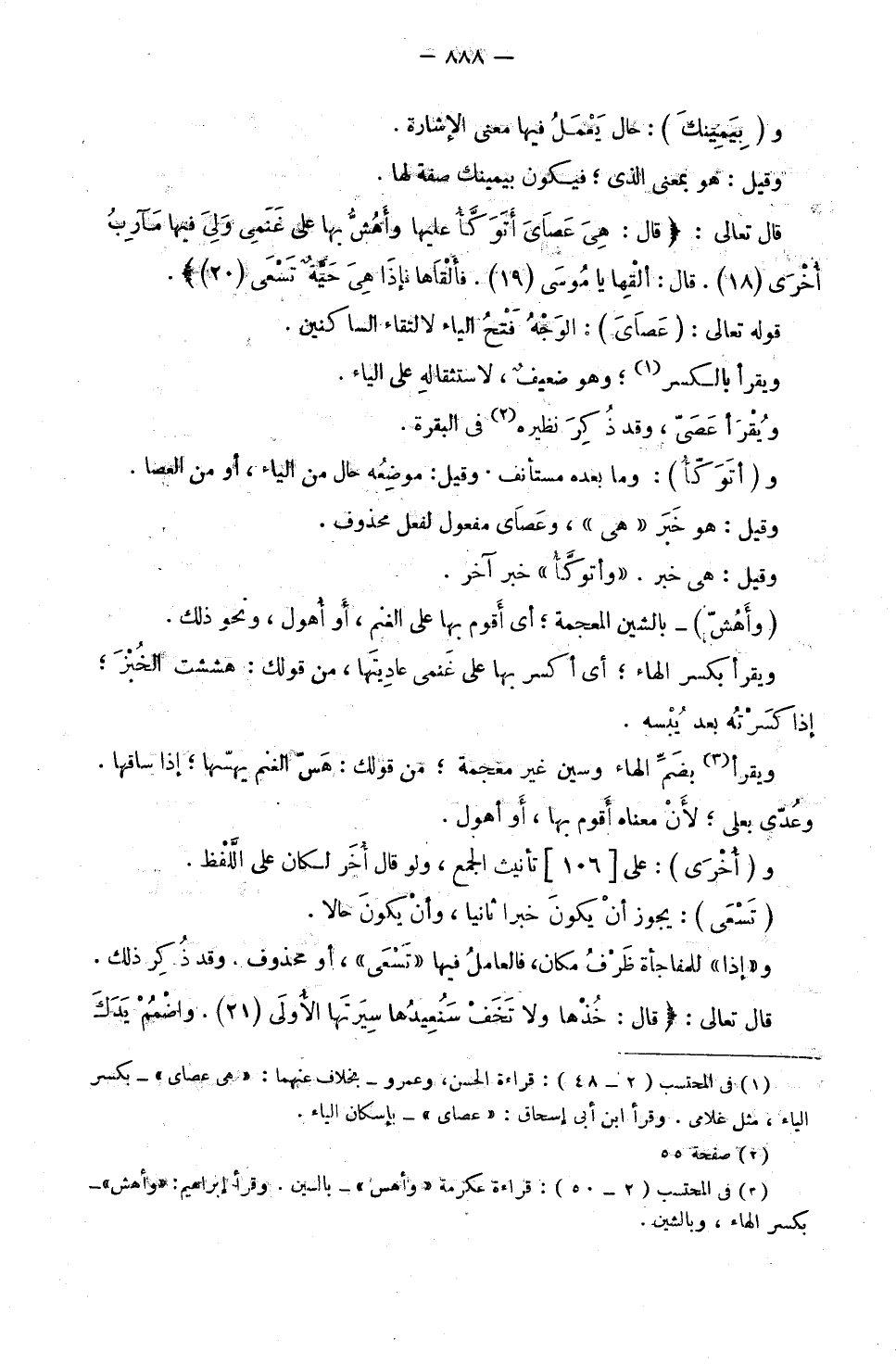 قَوْلُهُ تَعَالَى: (عَصَايَ) : الْوَجْهُ فَتْحُ الْيَاءِ لِالْتِقَاءِ السَّاكِنَيْنِ.