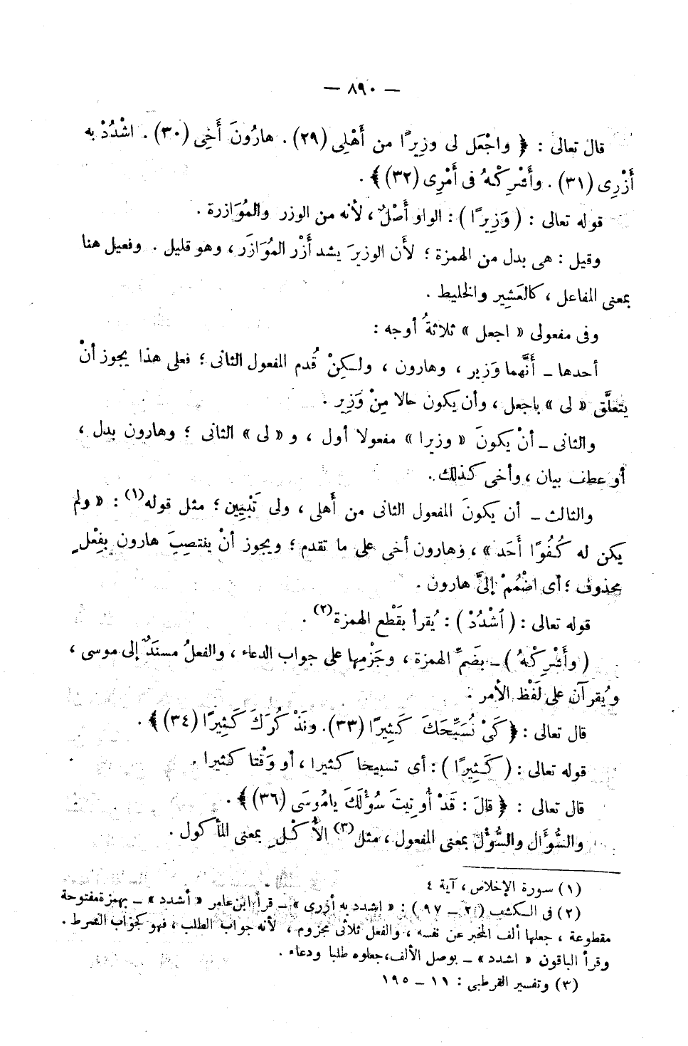 «أَخِي» كَذَلِكَ. وَالثَّالِثُ: أَنْ يَكُونَ الْمَفْعُولُ الثَّانِي «مِنْ أَهْلِي» وَ «لِي» تَبْيِينٌ ; مِثْلَ قَوْلِهِ: (وَلَمْ يَكُنْ لَهُ كُفُوًا أَحَدٌ) وَ «هَارُونَ أَخِي» عَلَى مَا تَقَدَّمَ ; وَيَجُوزُ أَنْ يَنْتَصِبَ (هَارُونَ) بِفِعْلٍ مَحْذُوفٍ ; أَيِ اضْمُمْ إِلَيَّ هَارُونَ. قَوْلُهُ تَعَالَى: (اشْدُدْ) : يُقْرَأُ بِقَطْعِ الْهَمْزَةِ. (وَأَشْرِكْهُ) - بِضَمِّ الْهَمْزَةِ، وَجَزْمِهَا عَلَى جَوَابِ الدُّعَاءِ، وَالْفِعْلُ مُسْنَدٌ إِلَى مُوسَى، وَيُقْرَآنِ عَلَى لَفْظِ الْأَمْرِ.