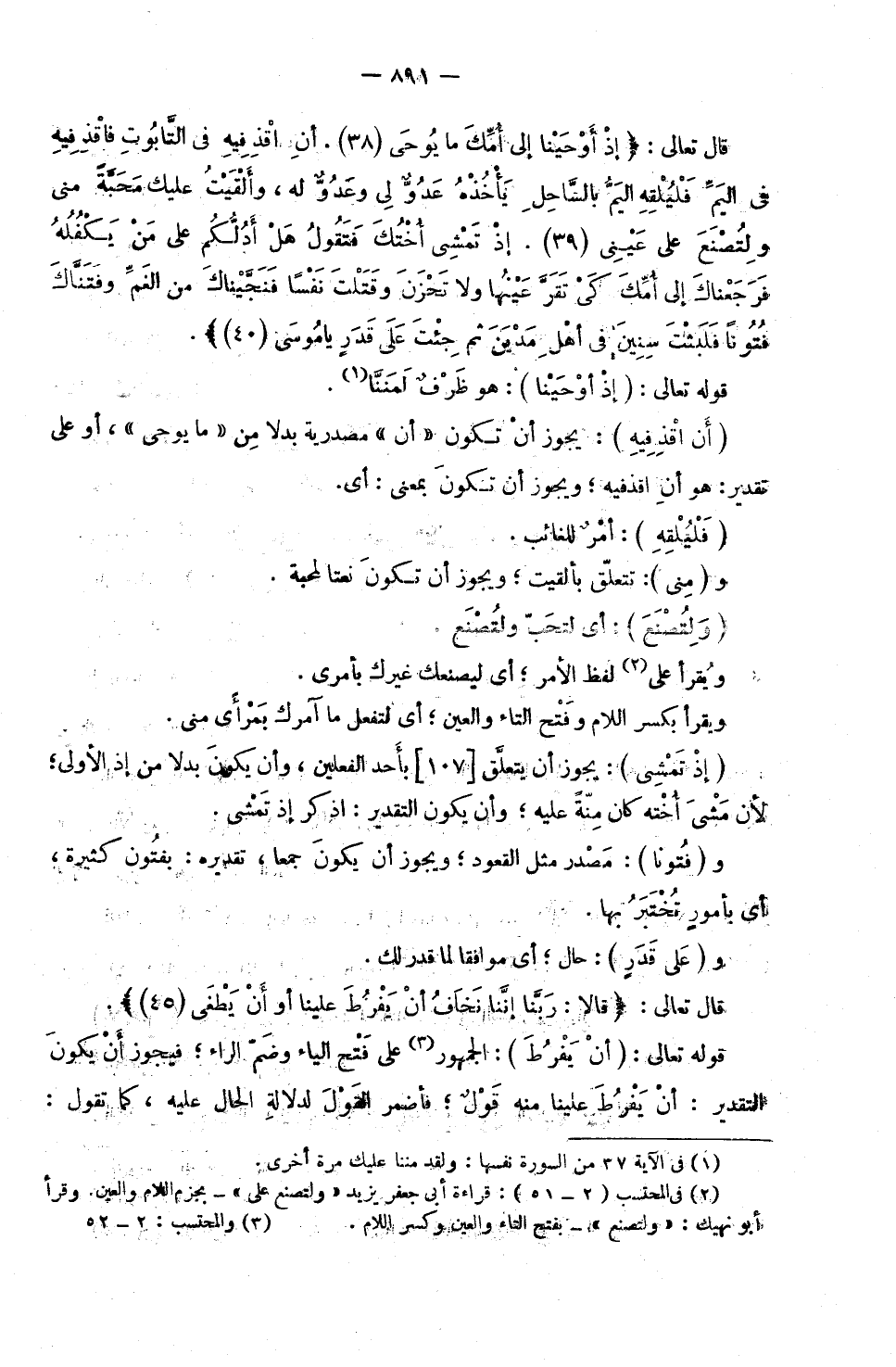 (أَنِ اقْذِفِيهِ) : يَجُوزُ أَنْ تَكُونَ (أَنْ) مَصْدَرِيَّةً بَدَلًا مِنْ (مَا يُوحَى) ، أَوْ عَلَى تَقْدِيرِ: هُوَ أَنِ اقْذِفِيهِ ; وَيَجُوزُ أَنْ تَكُونَ بِمَعْنَى: أَيْ. (فَلْيُلْقِهِ) : أَمْرٌ لِلْغَائِبِ. وَ (مِنِّي) : تَتَعَلَّقُ بِأَلْقَيْتُ ; وَيَجُوزُ أَنْ تَكُونَ نَعْتًا لِـ «مَحَبَّةً» . وَ (لِتُصْنَعَ) : أَيْ لِتُحَبَّ وَلِتُصْنَعَ.
