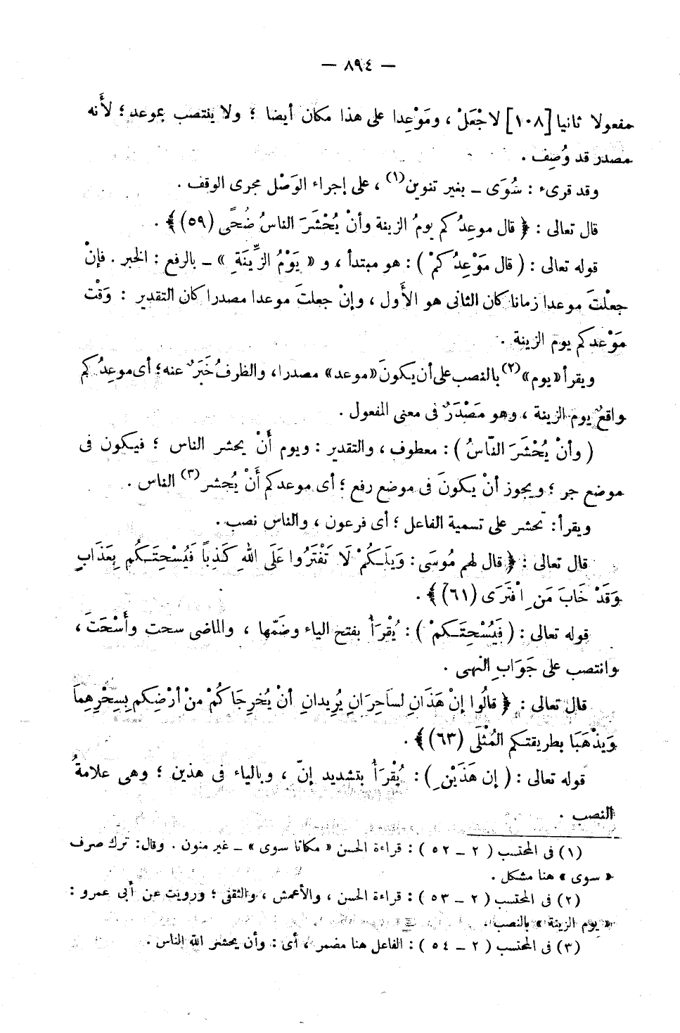 قَوْلُهُ تَعَالَى: (قَالَ مَوْعِدُكُمْ) : هُوَ مُبْتَدَأٌ، وَ «يَوْمُ الزِّينَةِ» بِالرَّفْعِ الْخَبَرُ. فَإِنْ جَعَلْتَ مَوْعِدًا زَمَانًا، كَانَ الثَّانِي هُوَ الْأَوَّلَ، وَإِنْ جَعَلْتَ مَوْعِدًا مَصْدَرًا، كَانَ التَّقْدِيرُ: وَقْتُ مَوْعِدِكُمْ يَوْمُ الزِّينَةِ. وَيُقْرَأُ «يَوْمَ» بِالنَّصْبِ عَلَى أَنْ يَكُونَ «مَوْعِدًا» مَصْدَرًا، وَالظَّرْفُ خَبَرٌ