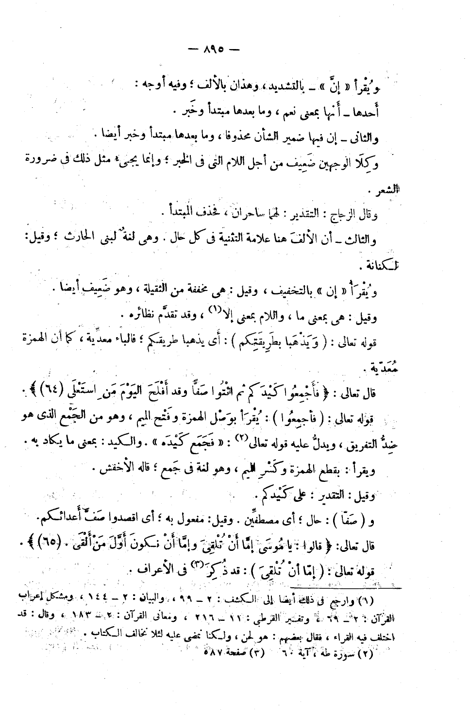 وَيُقْرَأُ (إِنَّ) بِالتَّشْدِيدِ، وَهَذَانِ بِالْأَلِفِ ; وَفِيهِ أَوْجُهٌ ; أَحَدُهَا: أَنَّهَا بِمَعْنَى نَعَمْ، وَمَا بَعْدَهَا مُبْتَدَأٌ وَخَبَرٌ. وَالثَّانِي: إِنَّ فِيهَا ضَمِيرُ الشَّأْنِ مَحْذُوفًا، وَمَا بَعْدَهَا مُبْتَدَأٌ وَخَبَرٌ أَيْضًا. وَكِلَا الْوَجْهَيْنِ ضَعِيفٌ مِنْ أَجْلِ اللَّامِ الَّتِي فِي الْخَبَرِ ; وَإِنَّمَا يَجِيءُ مِثْلُ ذَلِكَ فِي ضَرُورَةِ الشِّعْرِ.