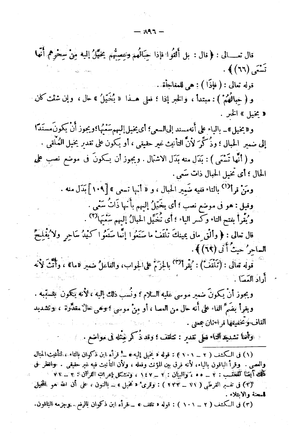 وَ (يُخَيَّلُ) - بِالْيَاءِ عَلَى أَنَّهُ مُسْنَدٌ إِلَى السَّعْيِ ; أَيْ يُخَيَّلُ إِلَيْهِمْ سَعْيُهَا ; وَيَجُوزُ أَنْ يَكُونَ مُسْنَدًا إِلَى ضَمِيرِ الْحِبَالِ ; وَذُكِّرَ لِأَنَّ التَّأْنِيثَ غَيْرُ حَقِيقِيٍّ، أَوْ يَكُونُ عَلَى تَقْدِيرِ يُخَيَّلُ الْمُلْقَى. وَ (أَنَّهَا تَسْعَى) : بَدَلٌ مِنْهُ بَدَلَ الِاشْتِمَالِ. وَيَجُوزُ أَنْ تَكُونَ فِي مَوْضِعِ نَصْبٍ عَلَى الْحَالِ ; أَيْ تُخَيَّلُ الْحِبَالُ ذَاتَ سَعْيٍ. وَمَنْ قَرَأَ بِالتَّاءِ فَفِيهِ ضَمِيرُ الْحِبَالِ، وَ «أَنَّهَا تَسْعَى» بَدَلٌ مِنْهُ. وَقِيلَ: هُوَ فِي مَوْضِعِ نَصْبٍ ; أَيْ يُخَيَّلُ إِلَيْهِمْ بِأَنَّهَا ذَاتُ سَعْيٍ. وَيُقْرَأُ بِفَتْحِ التَّاءِ وَكَسْرِ الْيَاءِ ; أَيْ تُخَيِّلُ الْحِبَالُ إِلَيْهِمْ سَعْيَهَا.