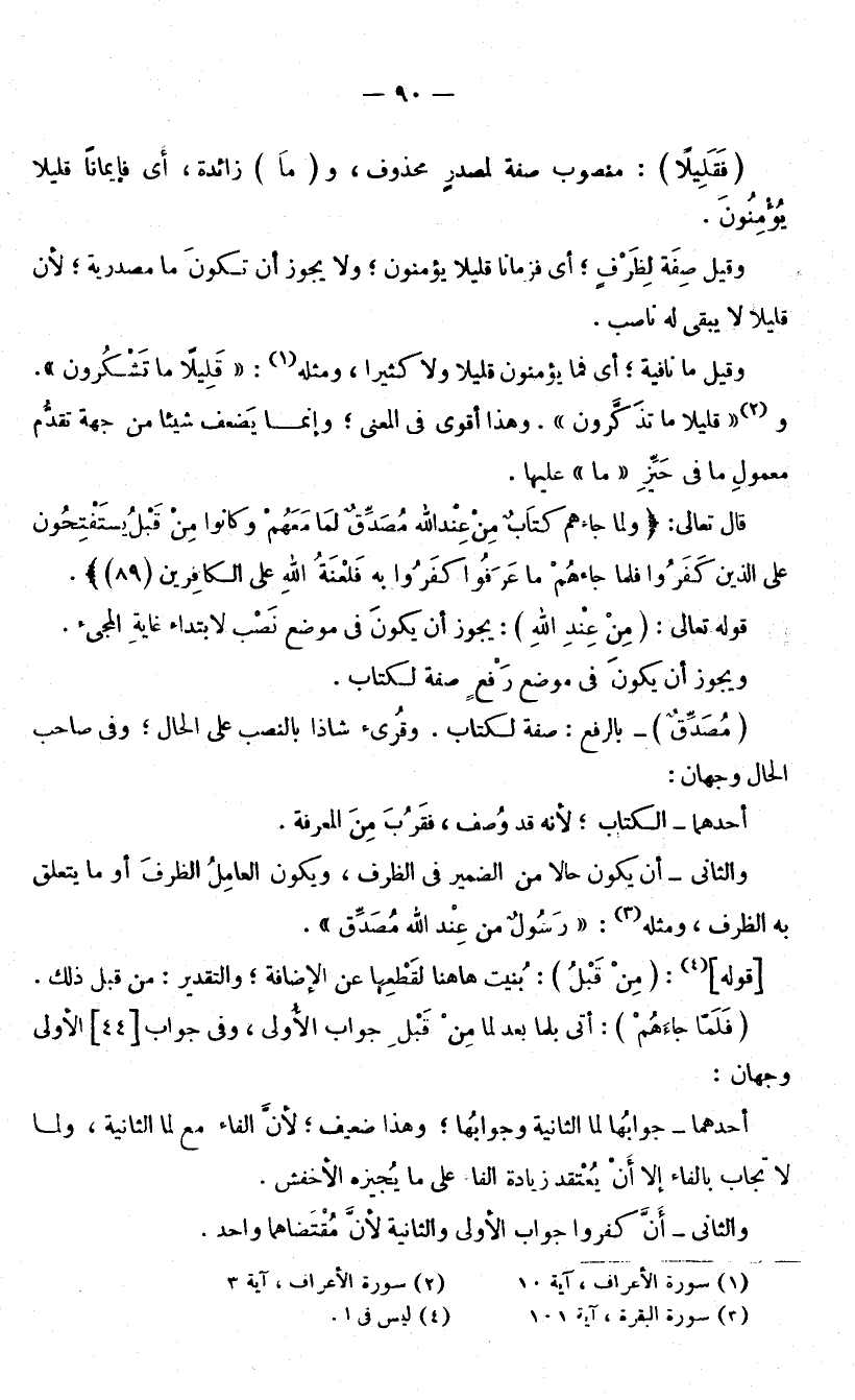 (فَقَلِيلًا) : مَنْصُوبٌ صِفَةٌ لِمَصْدَرٍ مَحْذُوفٍ، وَ (مَا) : زَائِدَةٌ، أَيْ فَإِيمَانًا قَلِيلًا يُؤْمِنُونَ. وَقِيلَ صِفَةٌ لِظَرْفٍ ; أَيْ فَزَمَانًا قَلِيلًا يُؤْمِنُونَ، وَلَا يَجُوزُ أَنْ تَكُونَ مَا مَصْدَرِيَّةٌ ; لِأَنَّ قَلِيلًا لَا يَبْقَى لَهُ نَاصِبٌ. وَقِيلَ: مَا نَافِيَةٌ ; أَيْ فَمَا يُؤْمِنُونَ قَلِيلًا وَلَا كَثِيرًا وَمِثْلُهُ (قَلِيلًا مَا تَشْكُرُونَ) وَ (قَلِيلًا مَا تَذَكَّرُونَ) وَهَذَا أَقْوَى فِي الْمَعْنَى وَإِنَّمَا يَضْعُفُ شَيْئًا مِنْ جِهَةِ تَقَدُّمِ مَعْمُولِ مَا فِي حَيِّزِ مَا عَلَيْهَا.