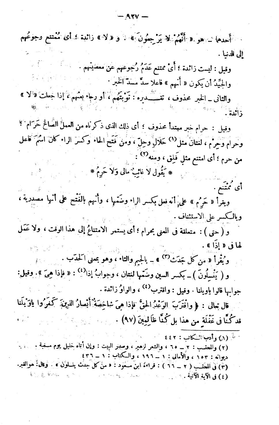 أَحَدُهُمَا: هُوَ «أَنَّهُمْ لَا يَرْجِعُونَ» وَ «لَا» زَائِدَةٌ ; أَيْ مُمْتَنَعٌ رُجُوعُهُمْ إِلَى الدُّنْيَا. وَقِيلَ: لَيْسَتْ زَائِدَةً ; أَيْ مُمْتَنَعٌ عَدَمُ رُجُوعِهِمْ عَنْ مَعْصِيَتِهِمْ.