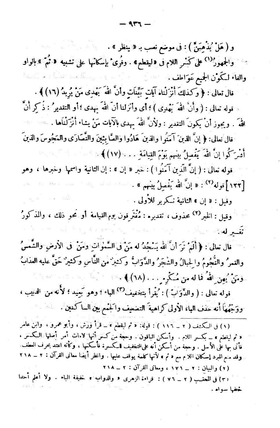 قَوْلُهُ تَعَالَى: (إِنَّ الَّذِينَ آمَنُوا) خَبَرُ «إِنَّ» : إِنَّ الثَّانِيَةُ وَاسْمُهَا وَخَبَرُهَا، وَهُوَ قَوْلُهُ: «إِنَّ اللَّهَ يَفْصِلُ بَيْنَهُمْ» وَقِيلَ: «إِنَّ» الثَّانِيَةَ تَكْرِيرٌ لِلْأُولَى. وَقِيلَ: الْخَبَرُ مَحْذُوفٌ، تَقْدِيرُهُ: مُفْتَرِقُونَ يَوْمَ الْقِيَامَةِ، أَوْ نَحْوَ ذَلِكَ، وَالْمَذْكُورُ تَفْسِيرٌ لَهُ.