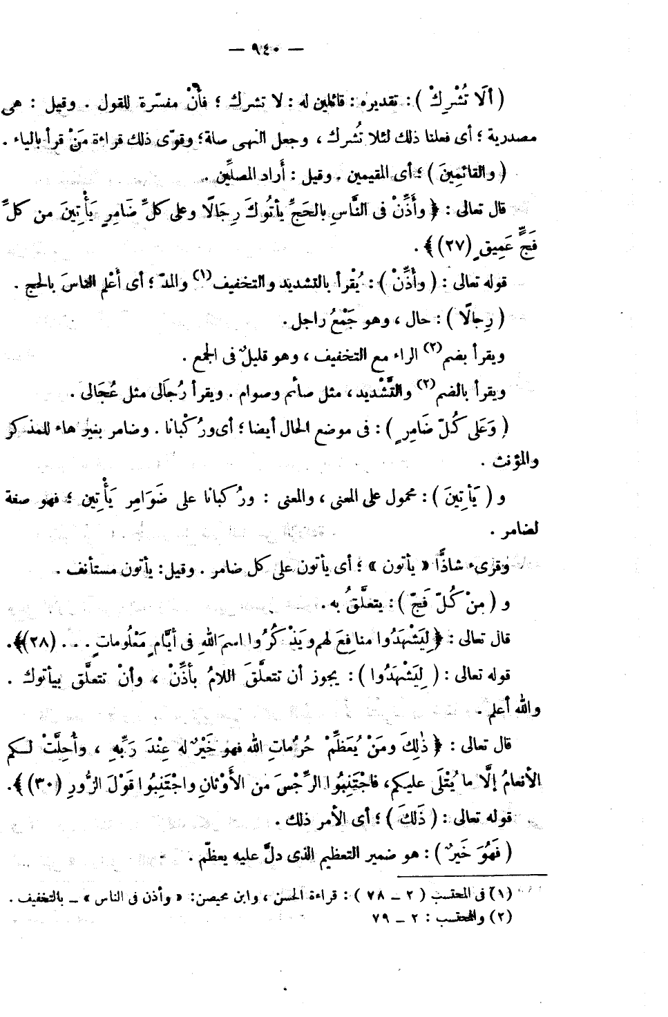 وَقُرِئَ شَاذًّا «يَأْتُونَ» أَيْ يَأْتُونَ عَلَى كُلِّ ضَامِرٍ. وَقِيلَ: «يَأْتُونَ» مُسْتَأْنَفٌ.