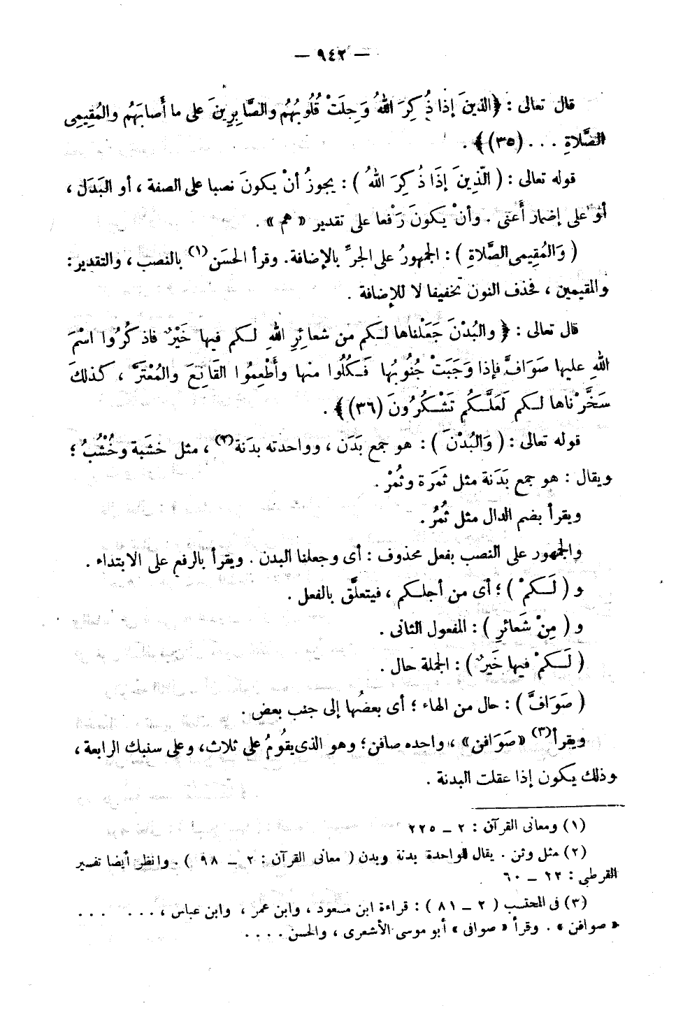 قَوْلُهُ تَعَالَى: (وَالْبُدْنَ) : هُوَ جَمْعُ بَدَنٍ، وَوَاحِدَتُهُ بَدَنَةٌ، مِثْلَ خَشَبَةٍ وَخَشَبٍ ; وَيُقَالُ هُوَ جَمْعُ بَدَنَةٍ، مِثْلَ ثَمَرَةٍ وَثَمَرٍ. وَيُقْرَأُ بِضَمِّ الدَّالِ مِثْلَ ثُمُرٍ.