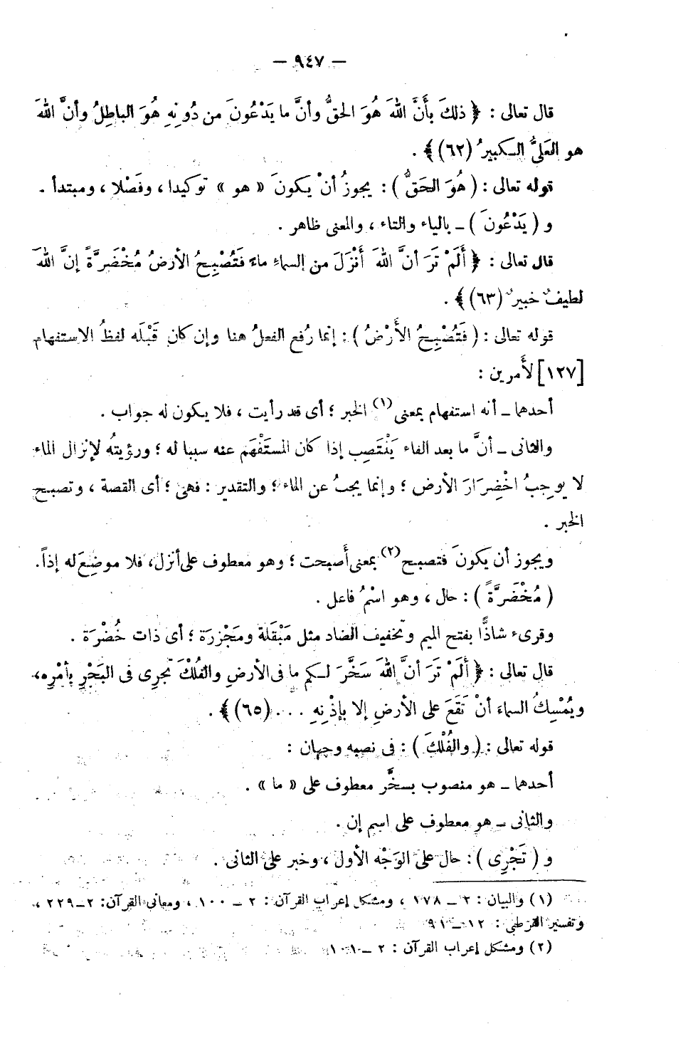 قَوْلُهُ تَعَالَى: (فَتُصْبِحُ الْأَرْضُ) : إِنَّمَا رَفَعَ الْفِعْلَ هُنَا وَإِنْ كَانَ قَبْلَهُ لَفْظُ الِاسْتِفْهَامِ لِأَمْرَيْنِ ; أَحَدُهُمَا: أَنَّهُ اسْتِفْهَامٌ بِمَعْنَى الْخَبَرِ ; أَيْ قَدْ رَأَيْتَ، فَلَا يَكُونُ لَهُ جَوَابٌ. وَالثَّانِي: أَنَّ مَا بَعْدَ الْفَاءِ يَنْتَصِبُ إِذَا كَانَ الْمُسْتَفْهَمُ عَنْهُ سَبَبًا لَهُ ; وَرُؤْيَتُهُ لِإِنْزَالِ الْمَاءِ لَا يُوجِبُ اخْضِرَارَ الْأَرْضِ ; وَإِنَّمَا يَجِبُ عَنِ الْمَاءِ ; وَالتَّقْدِيرُ: فَهِيَ ; أَيِ الْقِصَّةُ، وَ «تُصْبِحُ» : الْخَبَرُ.